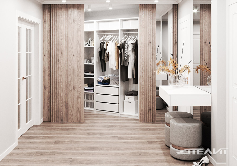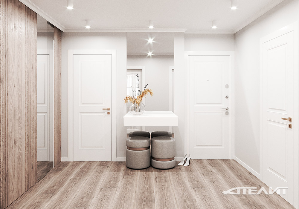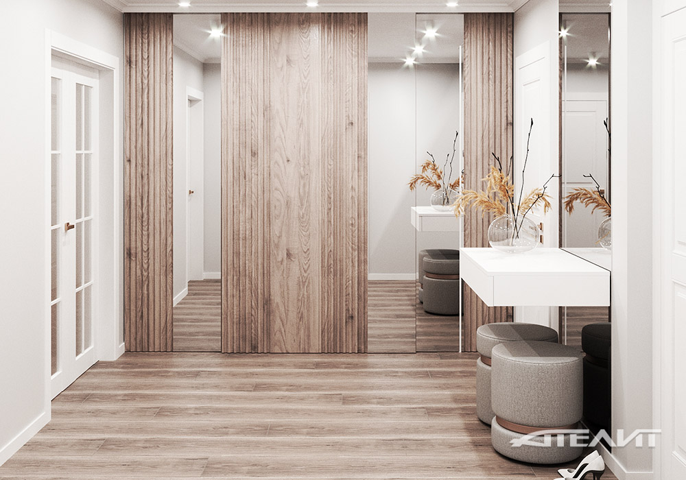 За счет специфической формы прихожей в ней удалось расположить весьма вместительный встроенный гардеробный шкаф, попутно избавив помещение от визуально негармоничного острого угла.