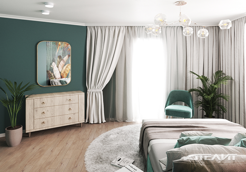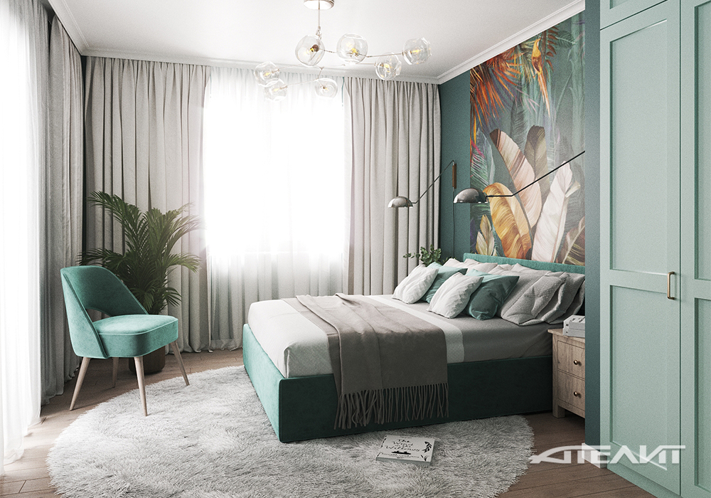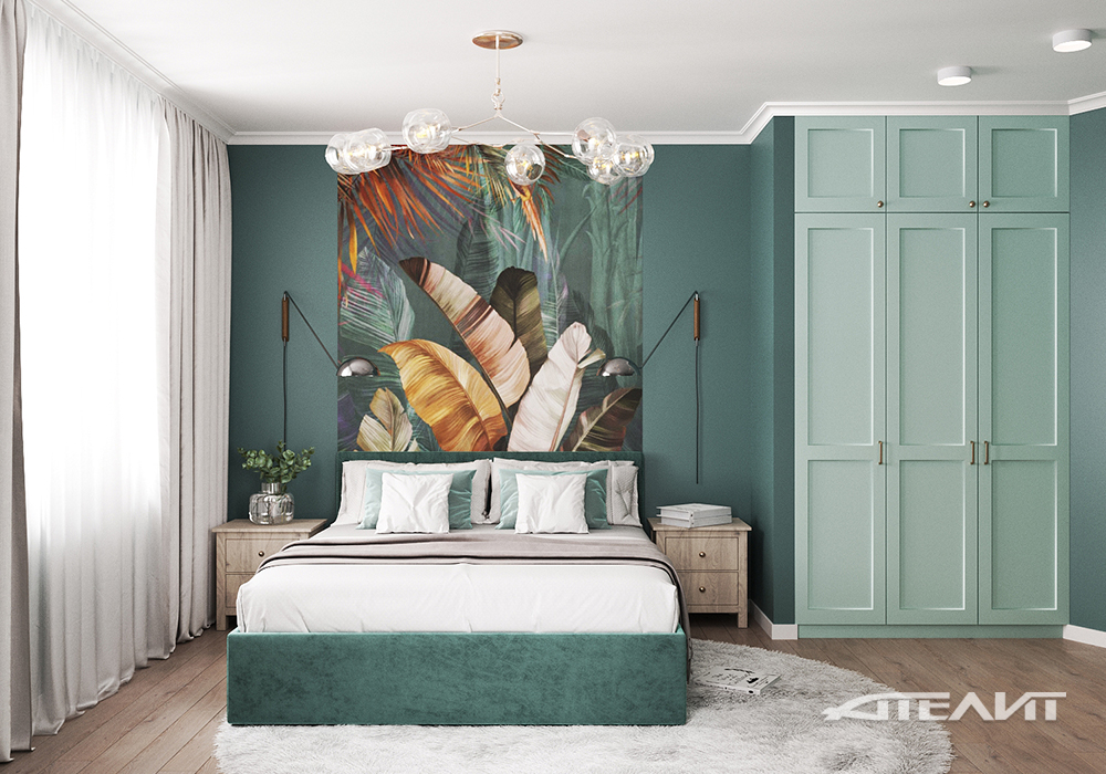 В интерьере спальни использованы насыщенные тона зеленого цвета в сочетании с крупными принтами с природными мотивами.