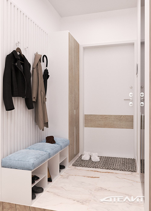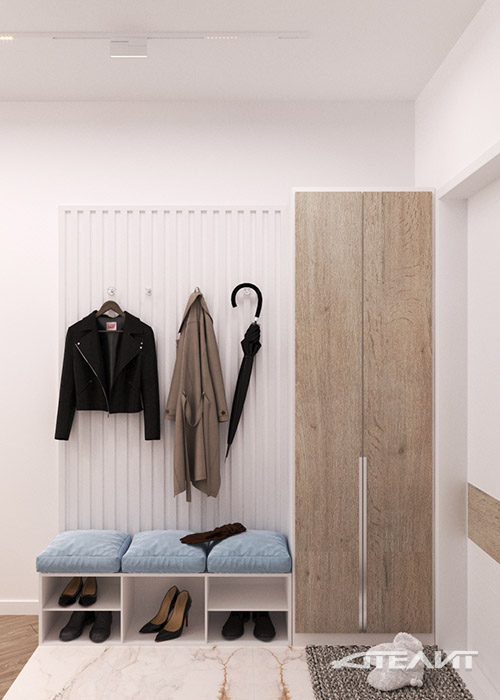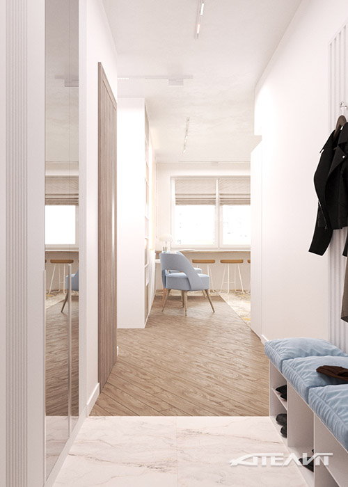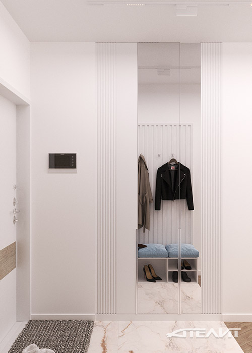 Ни сразу заметишь высокий и вместительный шкаф при входе в прихожую. Все внимание притягивает к себе огромное зеркало, в которое хочется смотреться и любоваться собой.