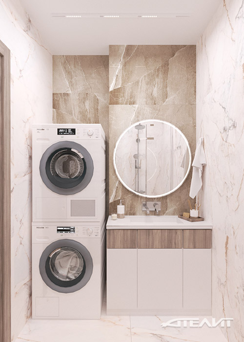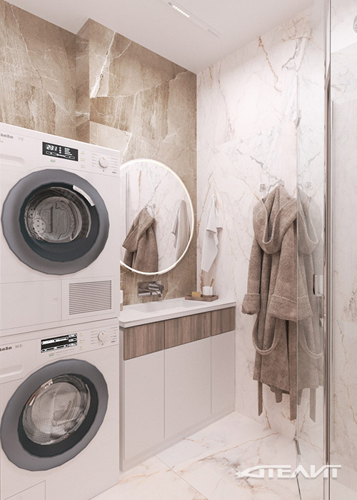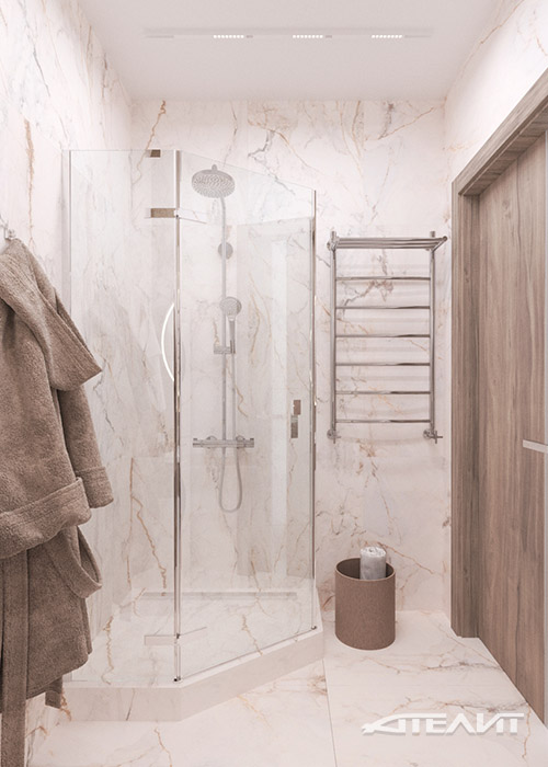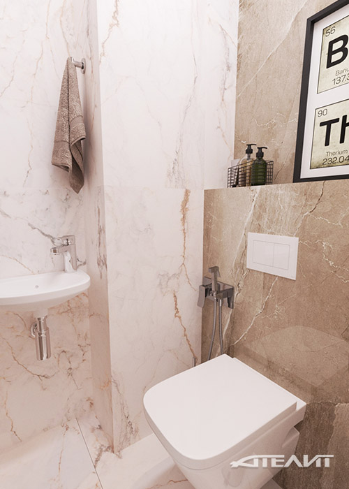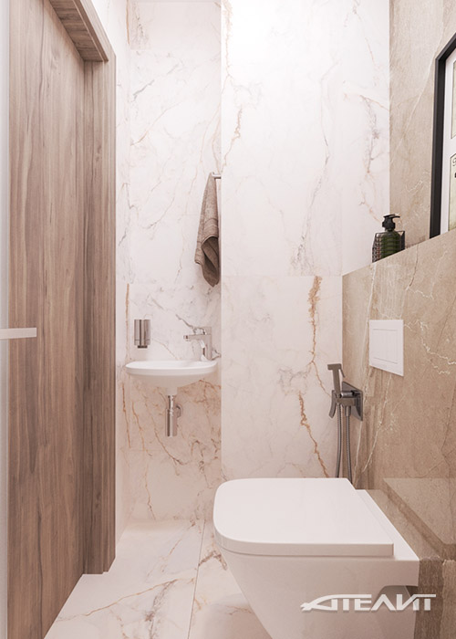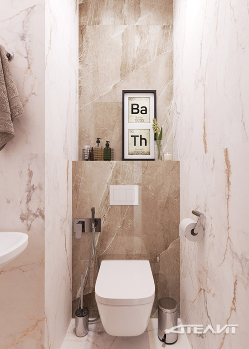 Санузел - Так как плитка под мрамор в ванной хороша сама по себе, но одним только камнем не обойтись, поэтому, чтобы сделать интерьер ванной более уютным, добавили в него теплую фактуру дерева.