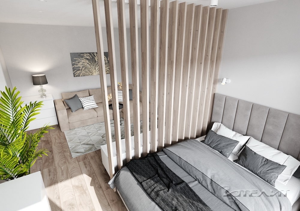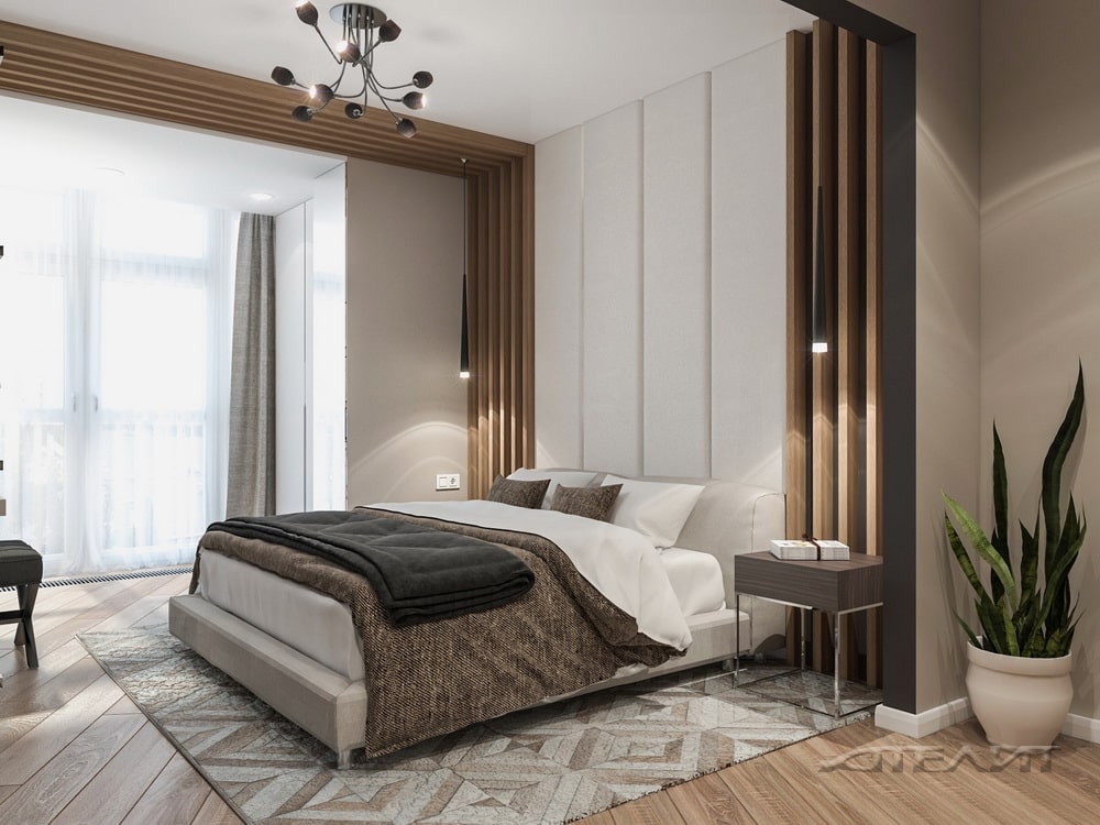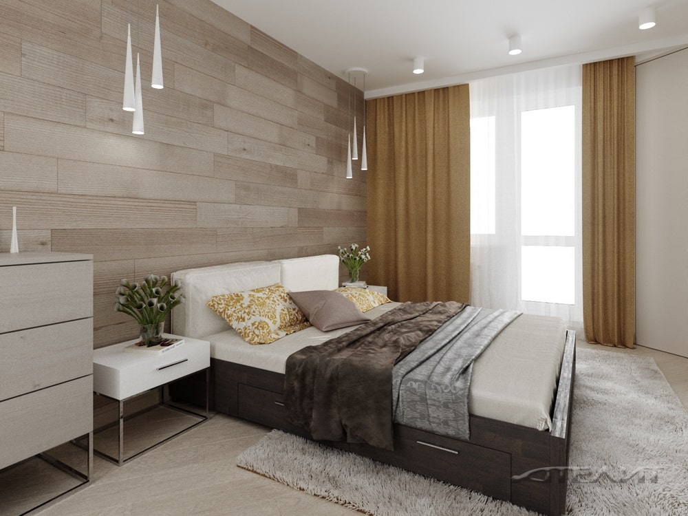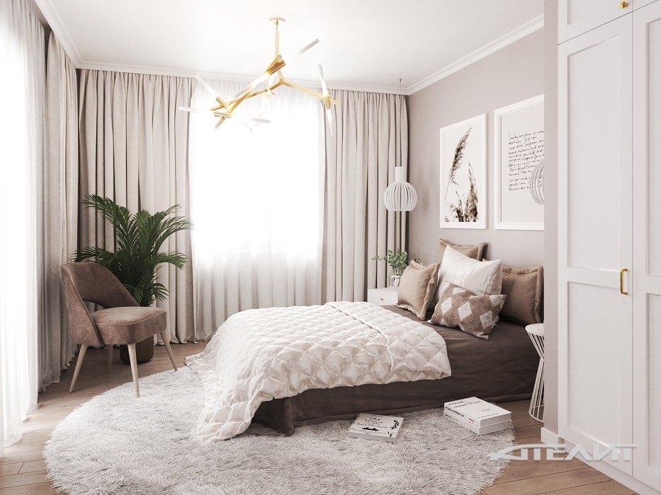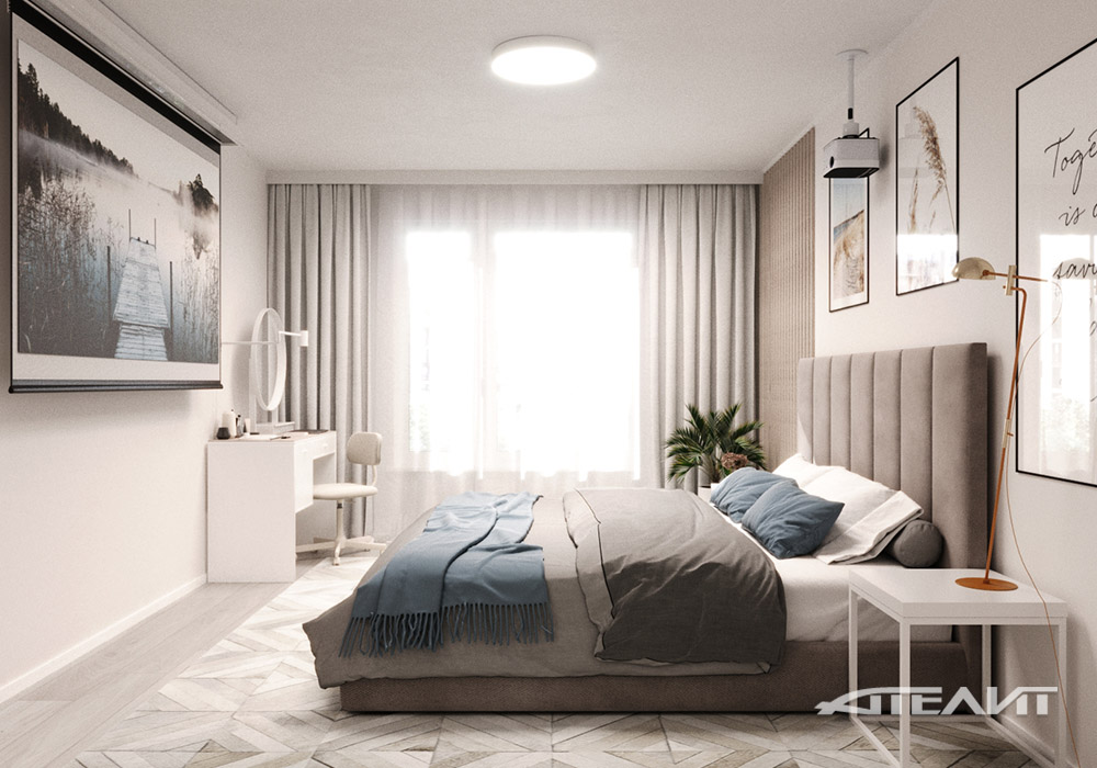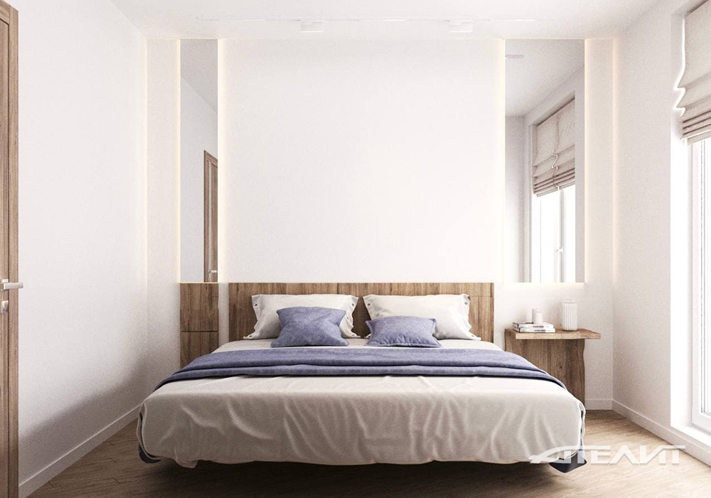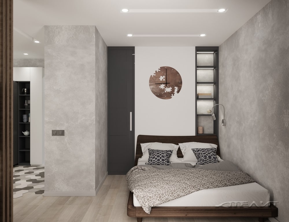 Дизайнеры решили разделить функциональные зоны с помощью грамотных инженерных решений, разработали привлекательный интерьер спальни, кухни, санузла и прихожей.