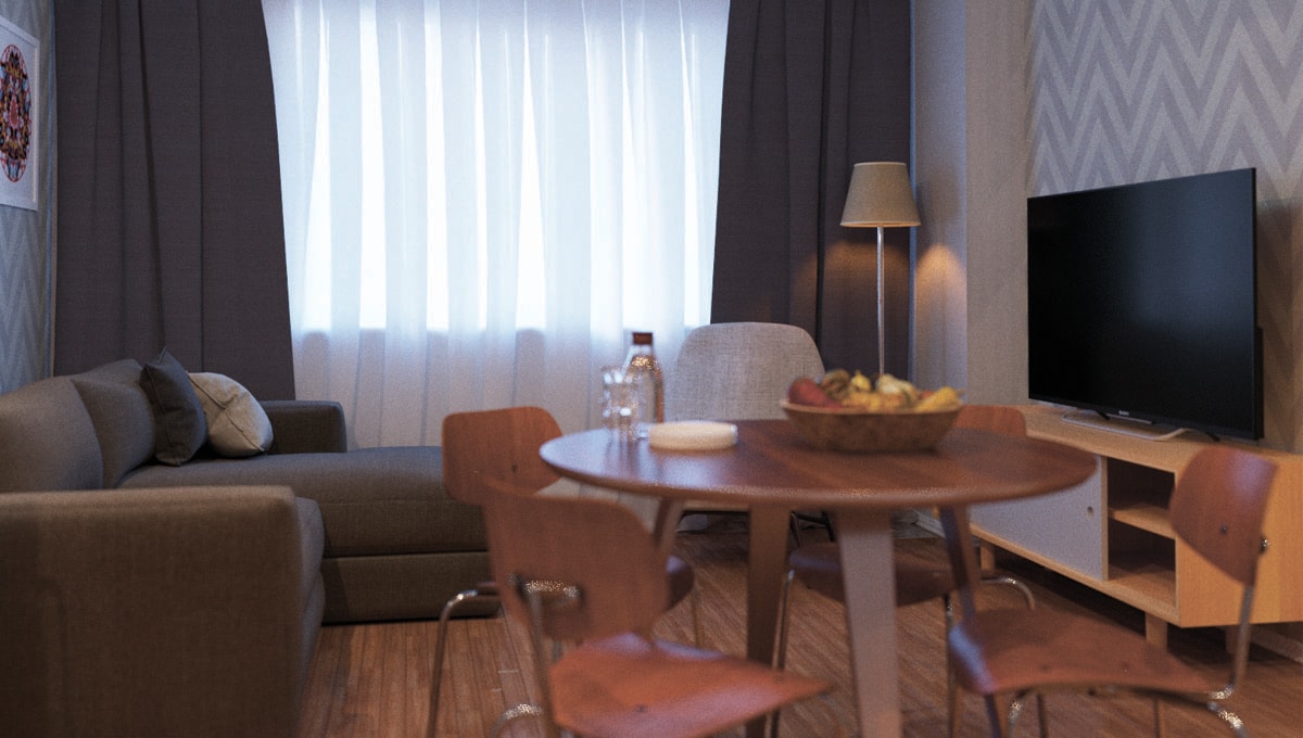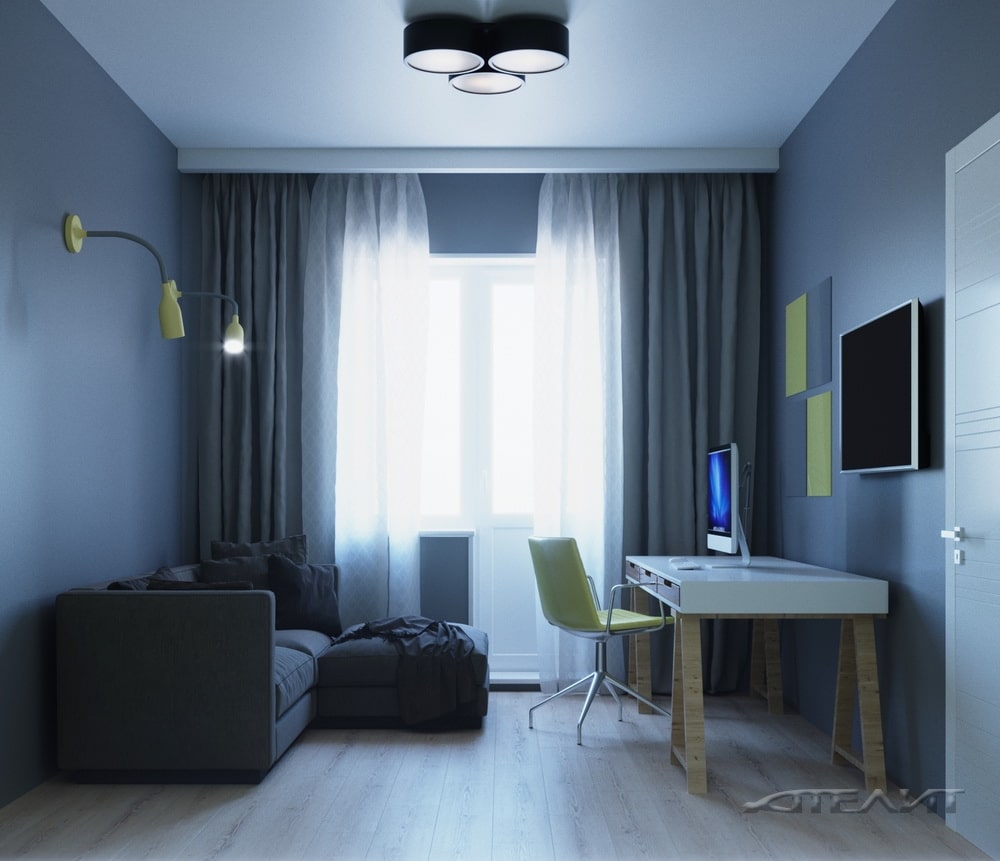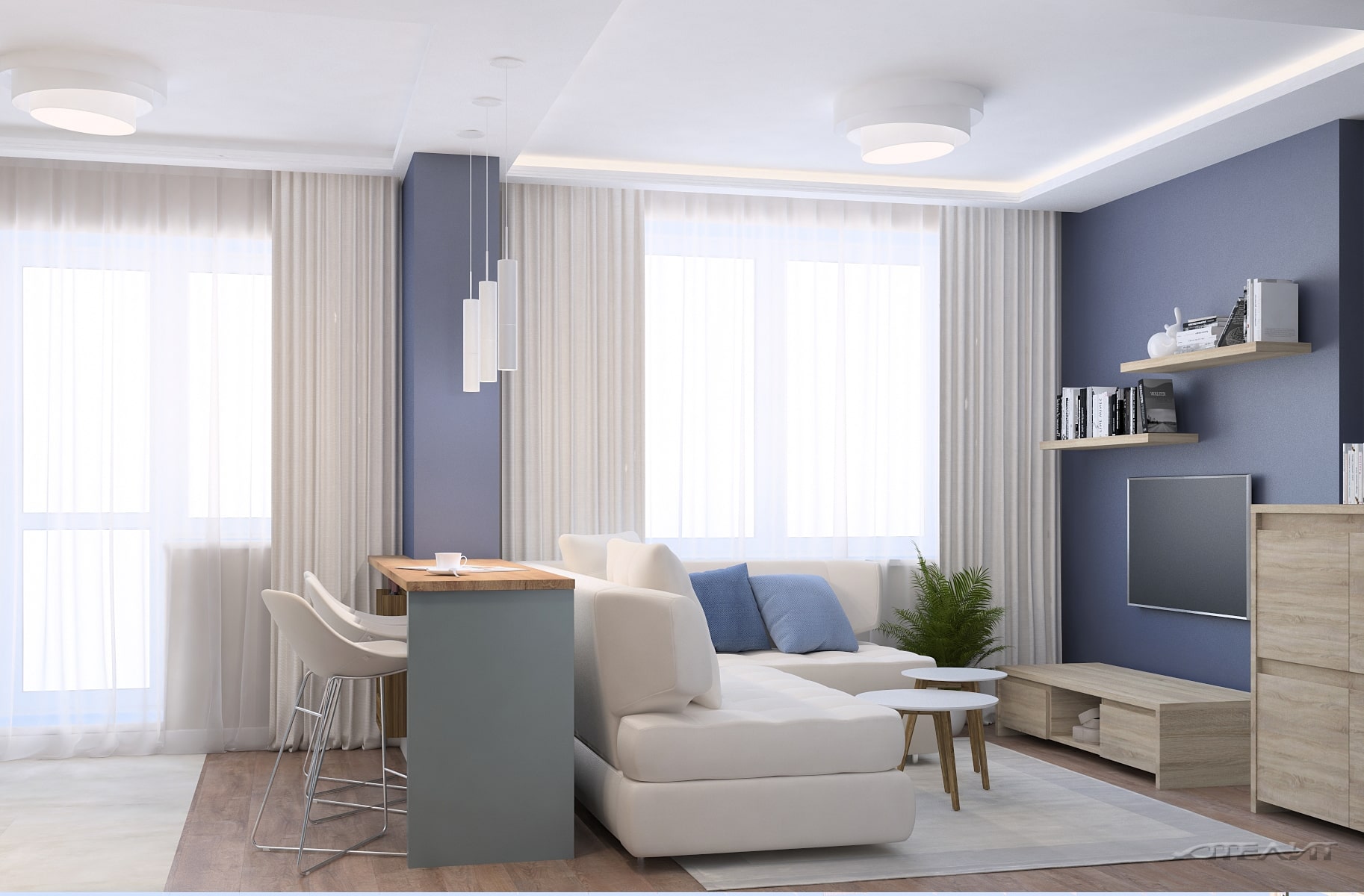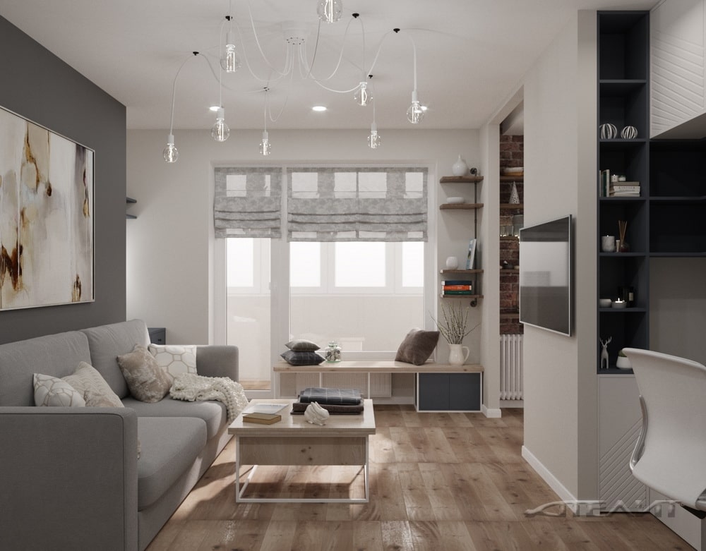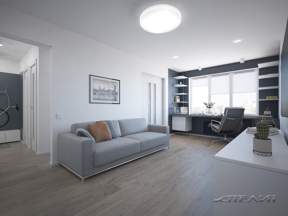 Задача: Обустроить современную удобную квартиру для молодых людей. Сформировать комфортное жилое пространство, совместить гостиную с местом отдыха и кабинетом, разделив функциональные зоны при помощи грамотных интерьерных решений. Разработать интерьер кухни, душевой и туалета. Грамотно распорядиться пространством в прихожей с учетом необходимости обустроить гардероб. Превратить балкон в продолжение жилого пространства.