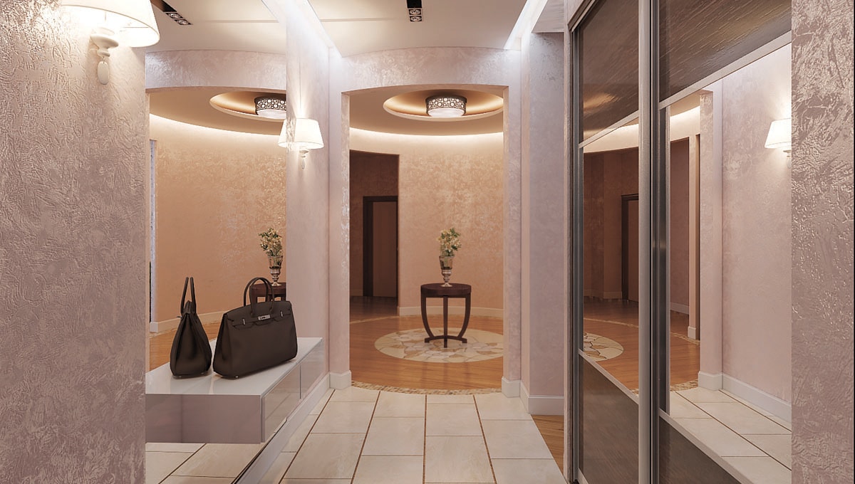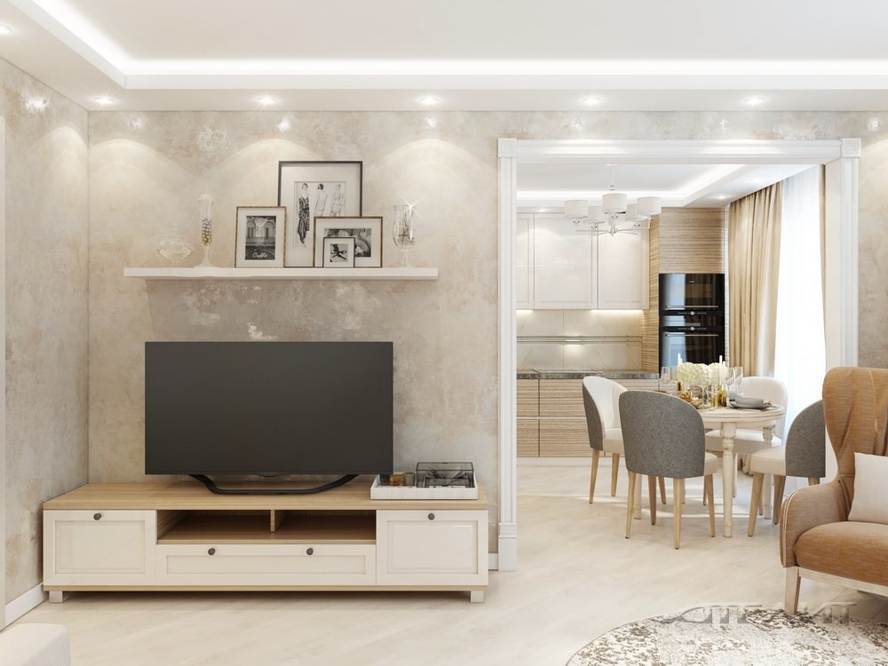 Преобладание теплых кремовых тонов в отделке стен, декоративная штукатурка Отточенто с мягкой шелковой фактурой и светлая мебель делают эту большую квартиру для семьи из четырех человек невероятно теплой и уютной. Планировка позволила разместить здесь две больших спальни, гостиную, совмещенную с кухней благодаря широкому проему, а также весьма вместительные шкафы, расположенные по всей протяженности коридора.