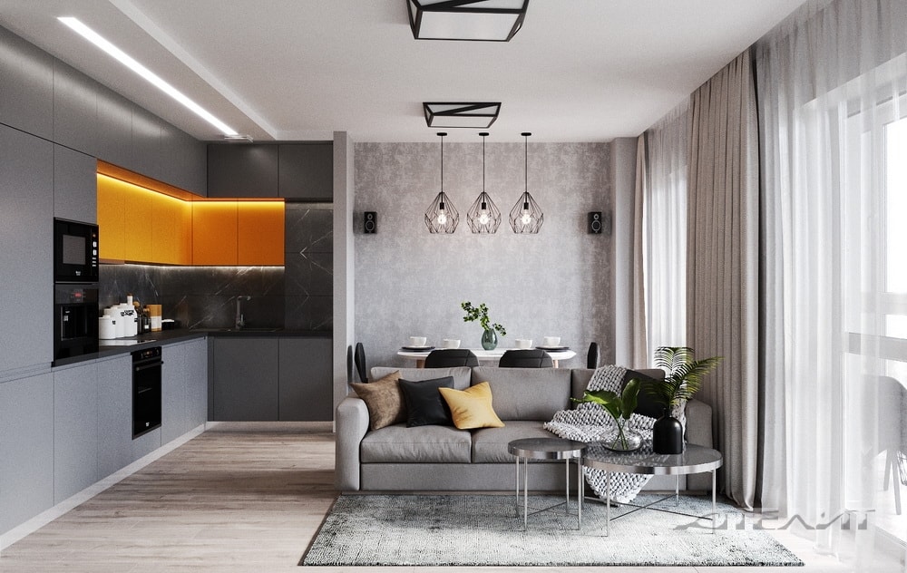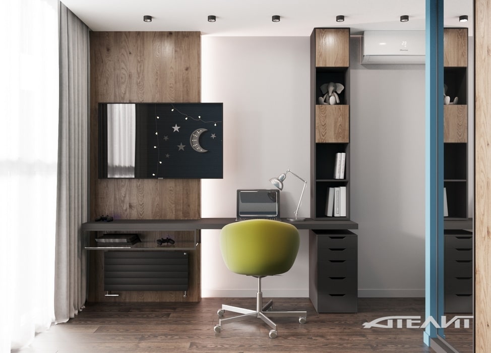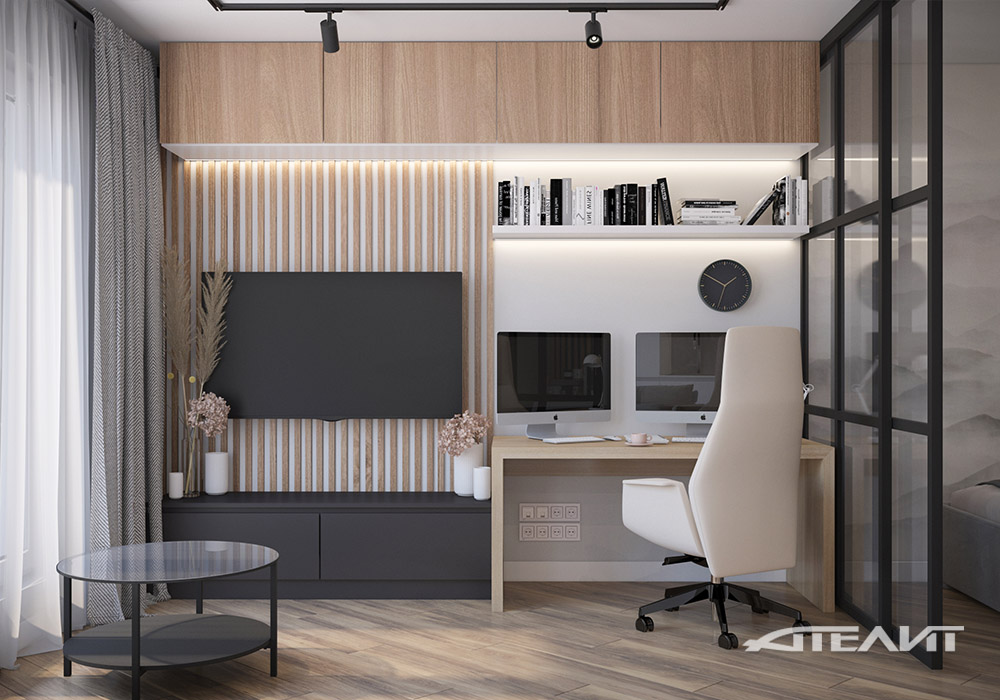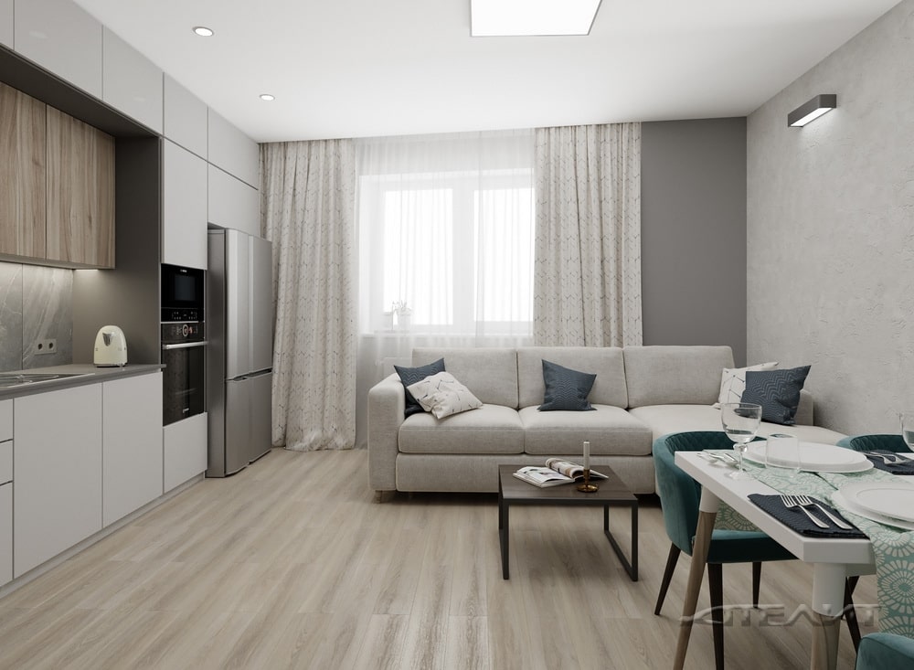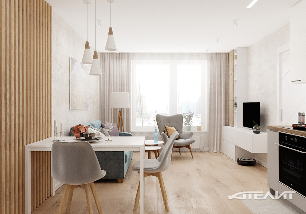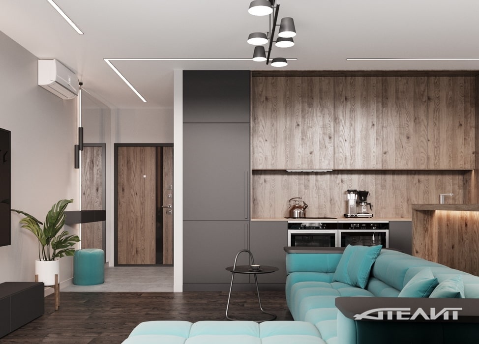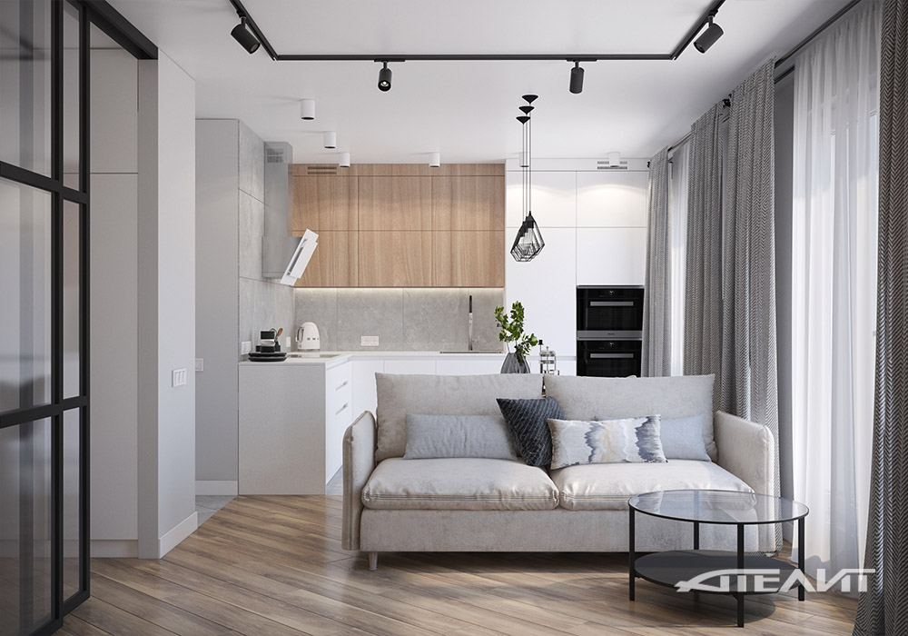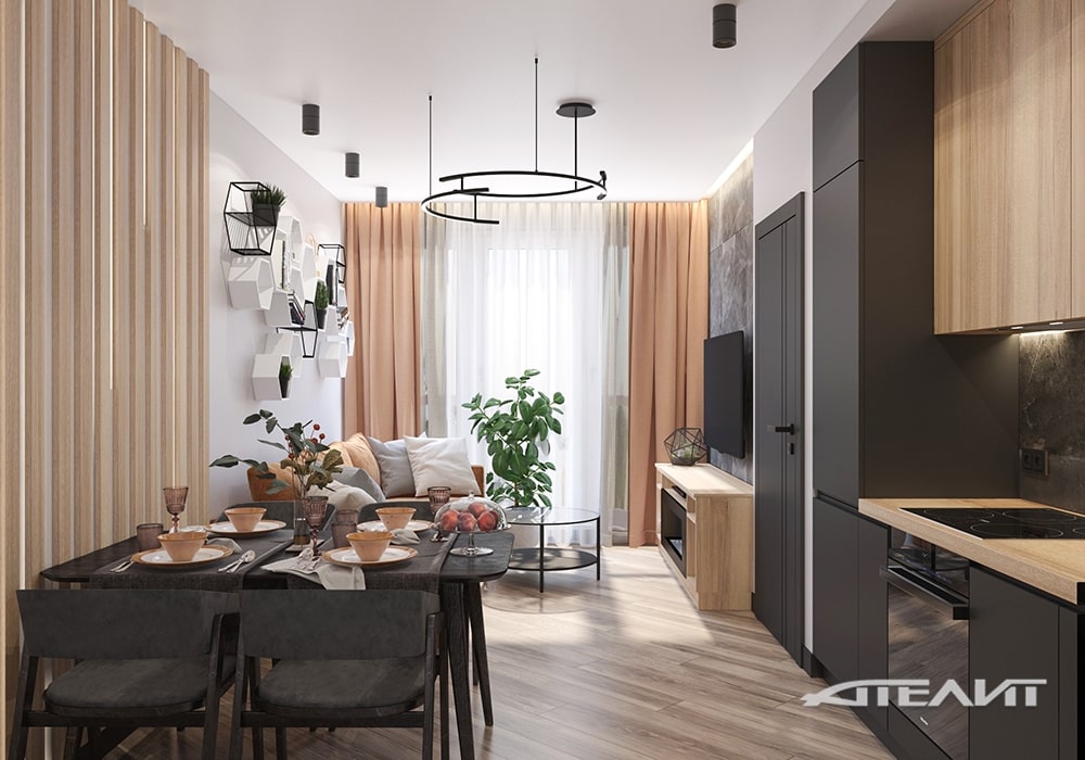 Компактная квартира с детской и спальней в современном стиле от компании «Ателит». Специалистам студии удалось создать удобное жилое пространство с учетом пожеланий обитателей. Кухня и гостиная преобразованы в единое помещение с грамотно разделенными функциональными зонами. Нашлось место даже для отдельной рабочей зоны, где можно с комфортом расположиться, если работа застала дома.