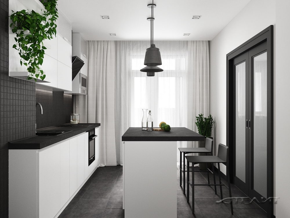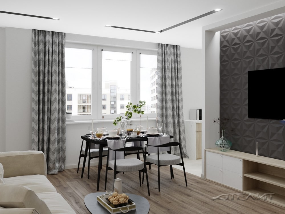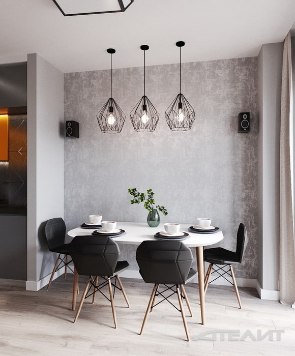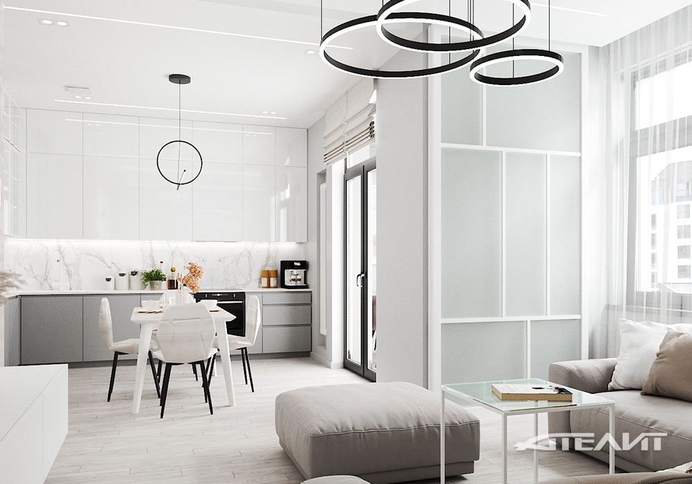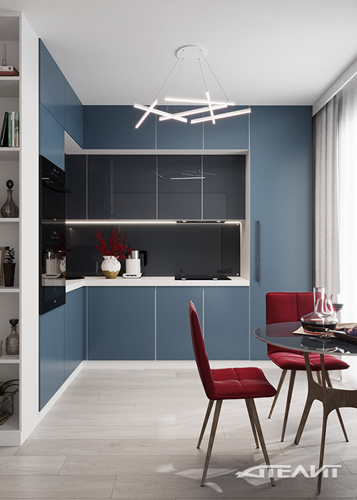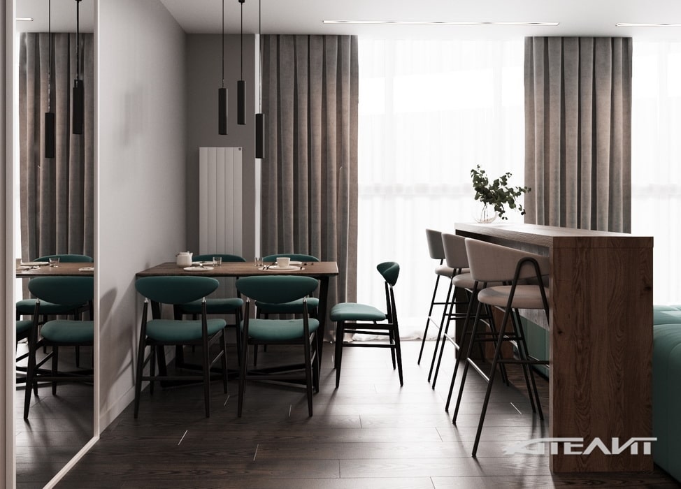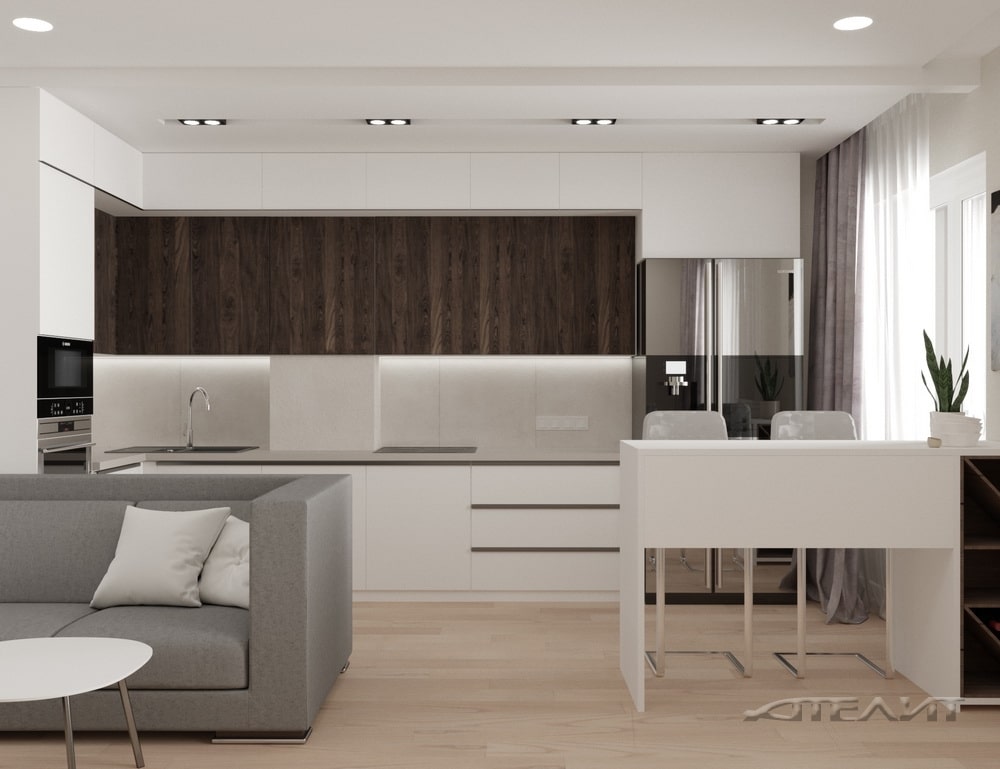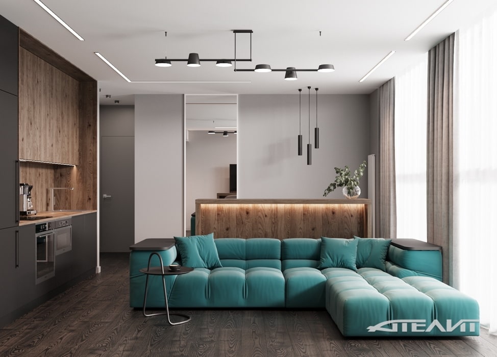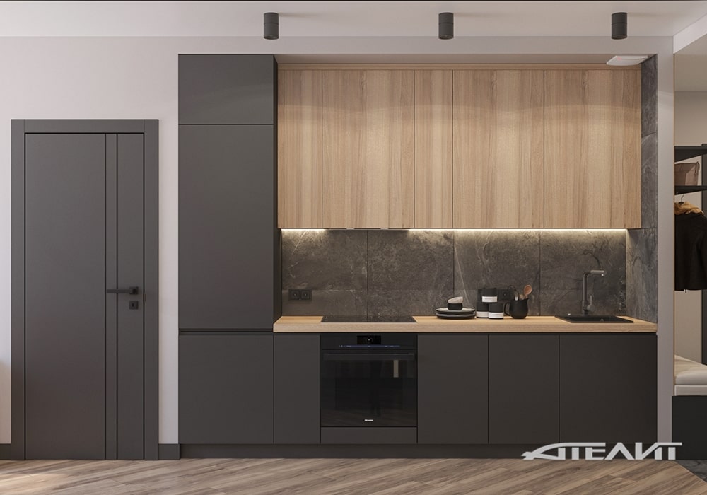 Компактная квартира с детской и спальней в современном стиле от компании «Ателит». Специалистам студии удалось создать удобное жилое пространство с учетом пожеланий обитателей. Кухня и гостиная преобразованы в единое помещение с грамотно разделенными функциональными зонами. Нашлось место даже для отдельной рабочей зоны, где можно с комфортом расположиться, если работа застала дома.