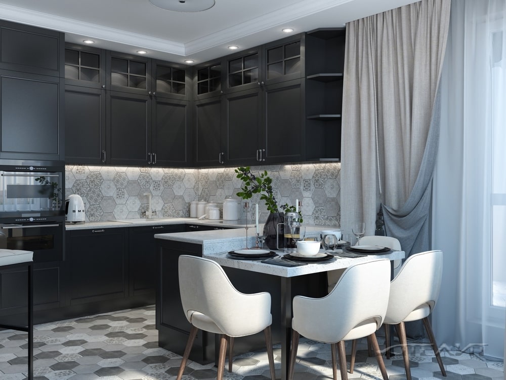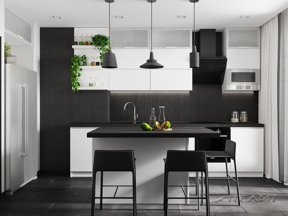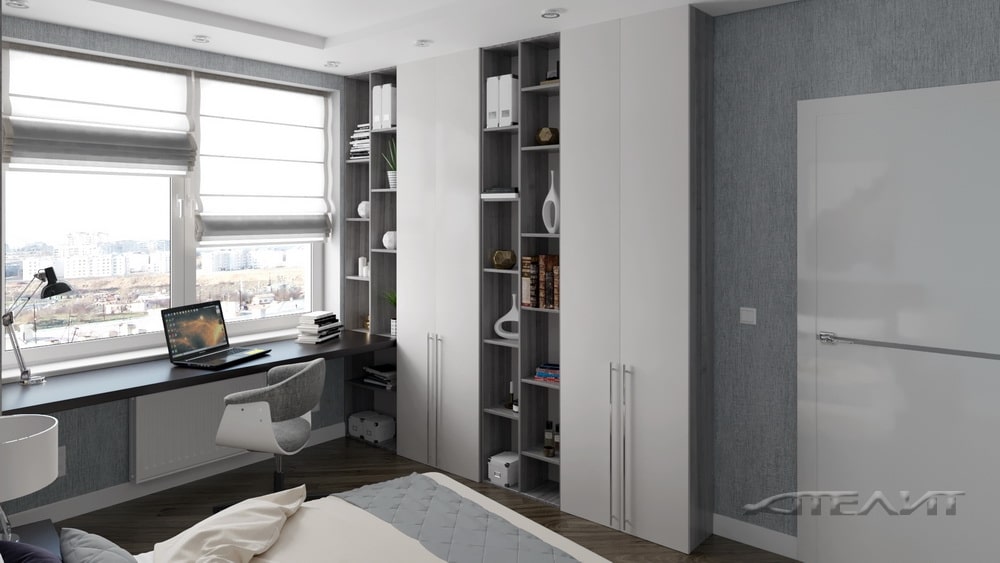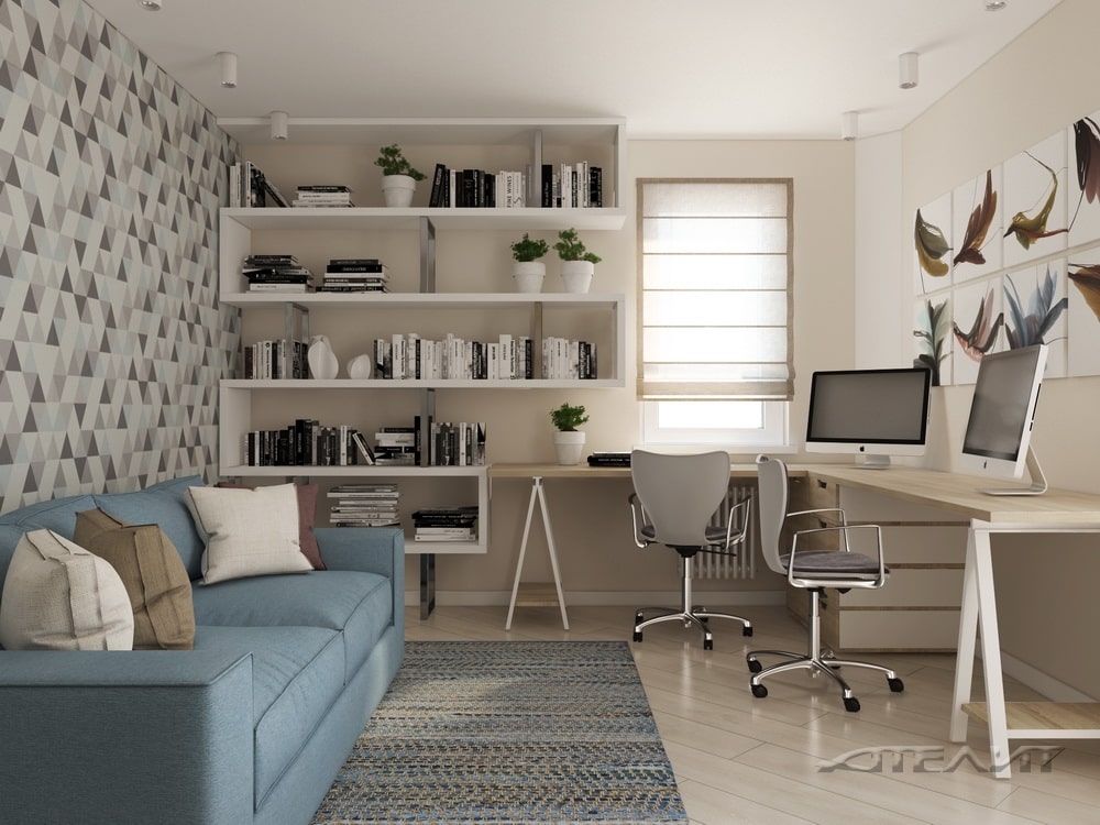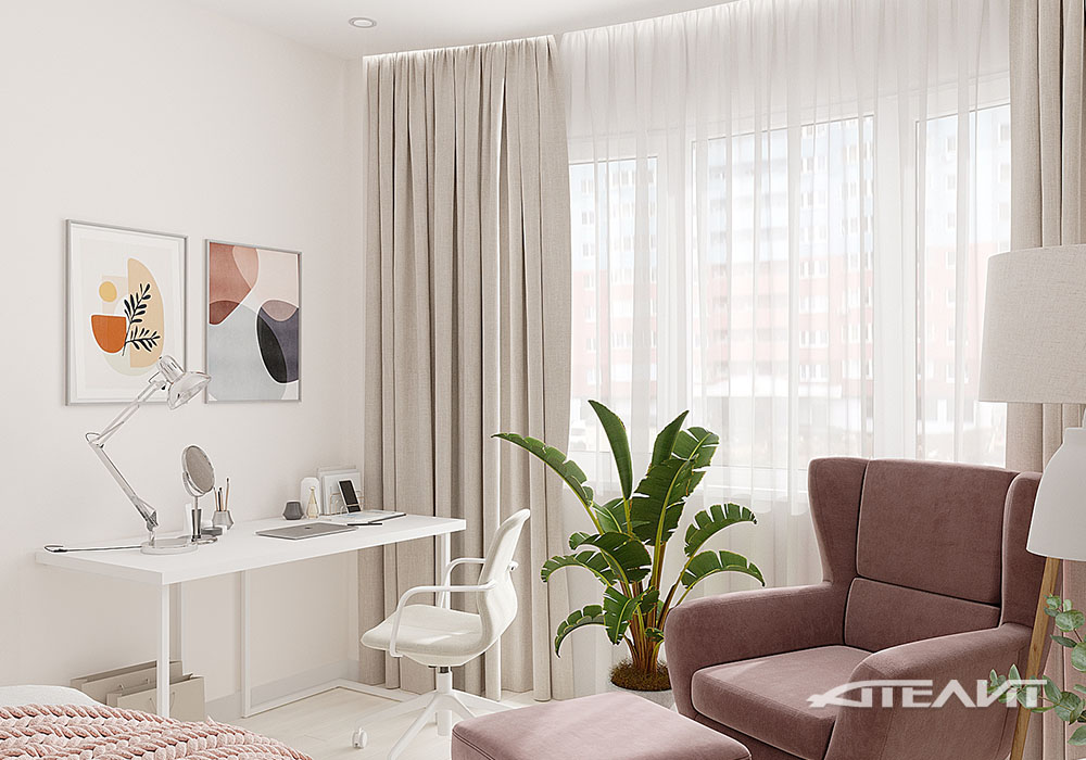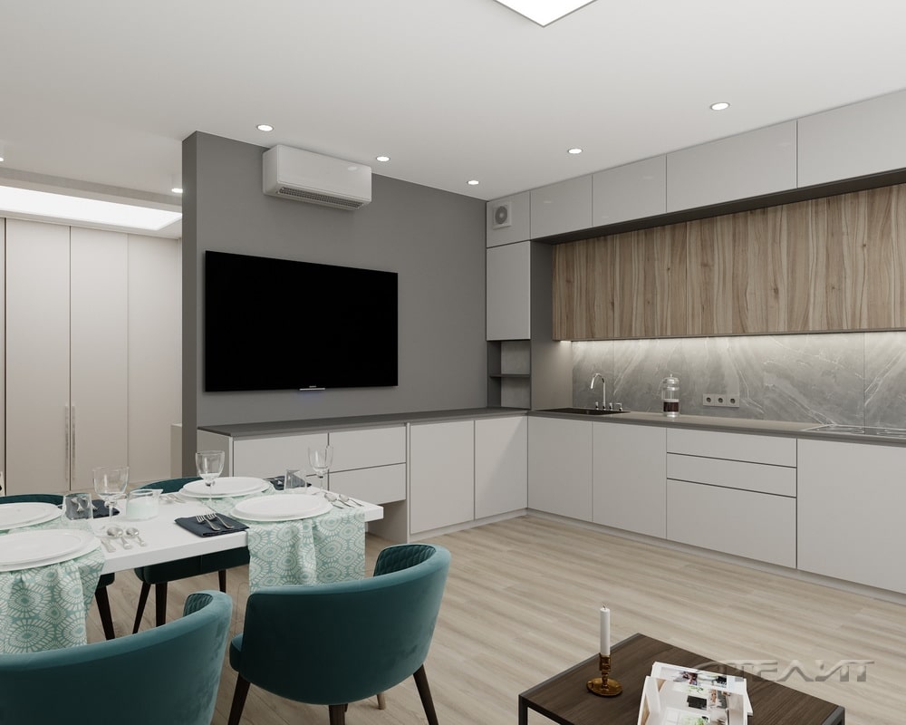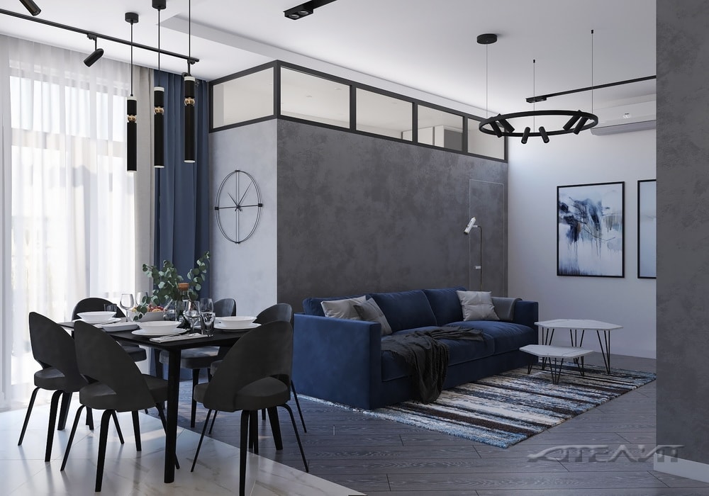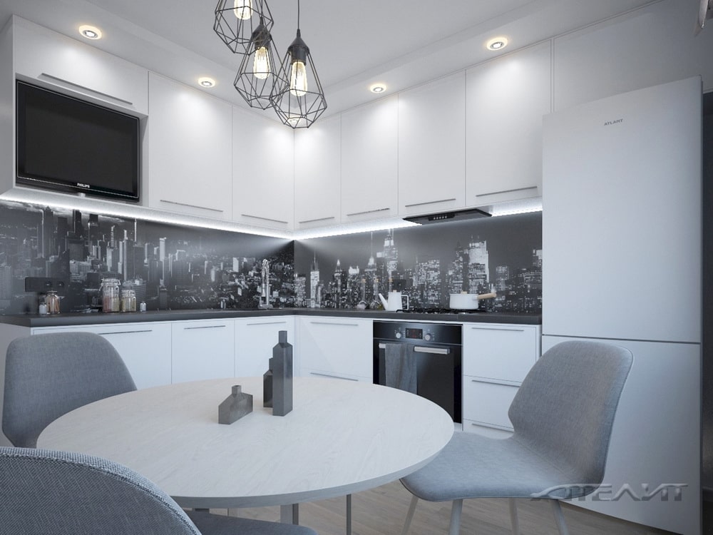 Компактная квартира с детской и спальней в современном стиле от компании «Ателит». Специалистам студии удалось создать удобное жилое пространство с учетом пожеланий обитателей. Кухня и гостиная преобразованы в единое помещение с грамотно разделенными функциональными зонами. Нашлось место даже для отдельной рабочей зоны, где можно с комфортом расположиться, если работа застала дома.