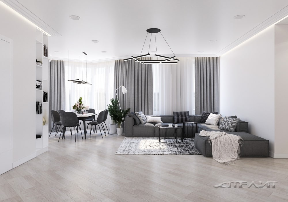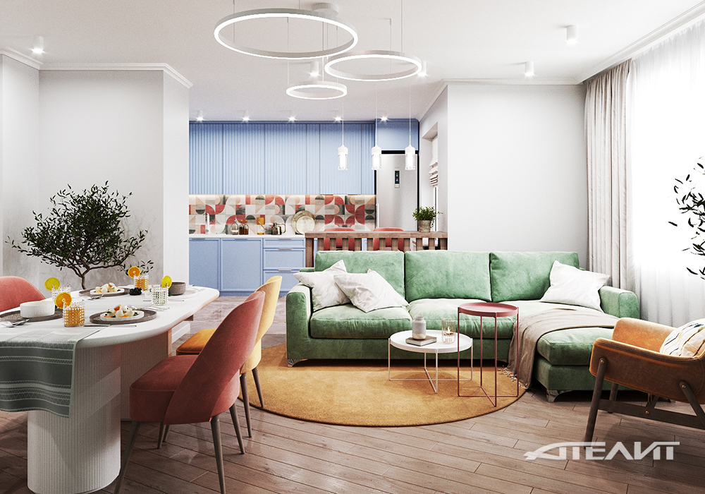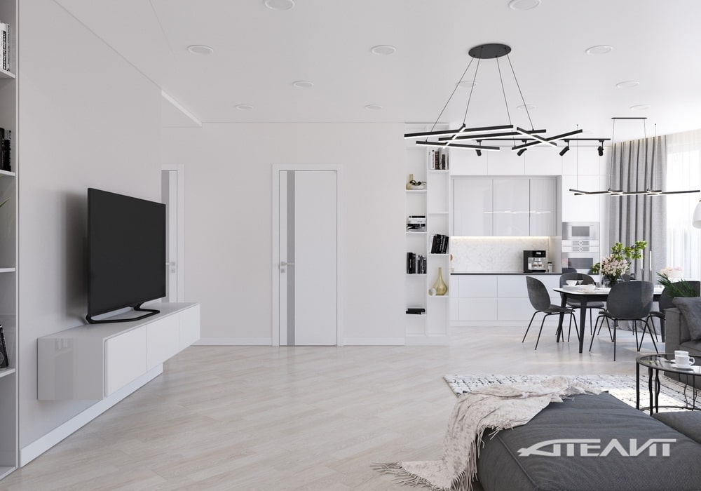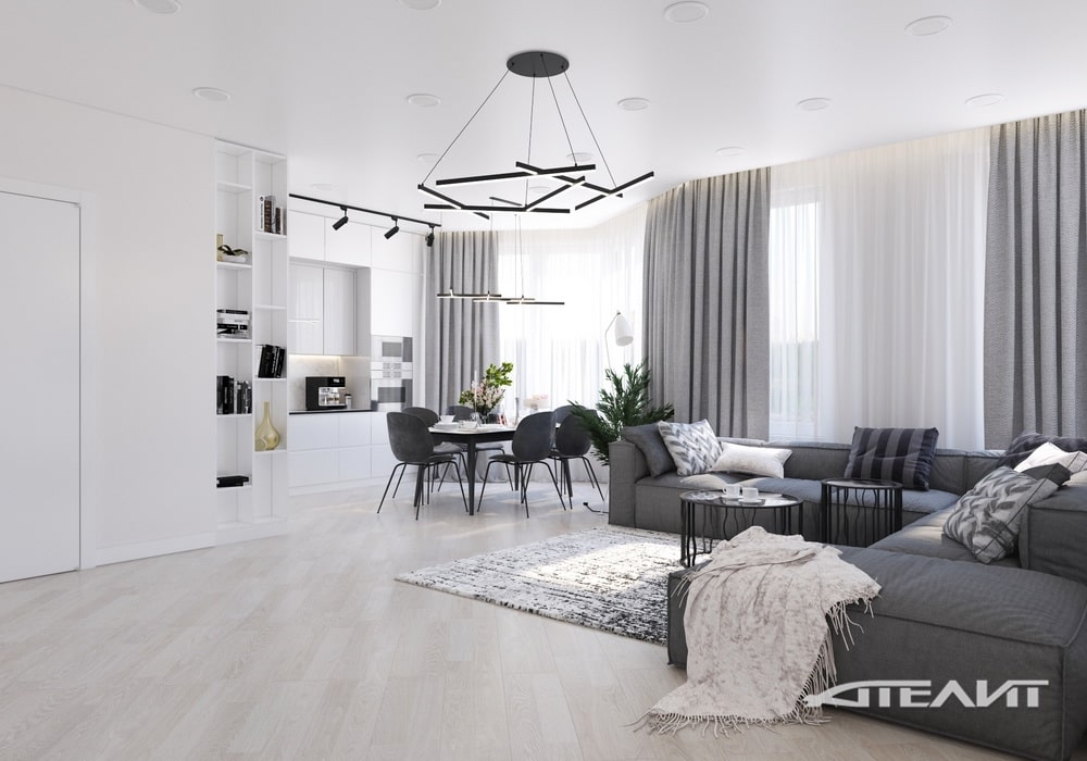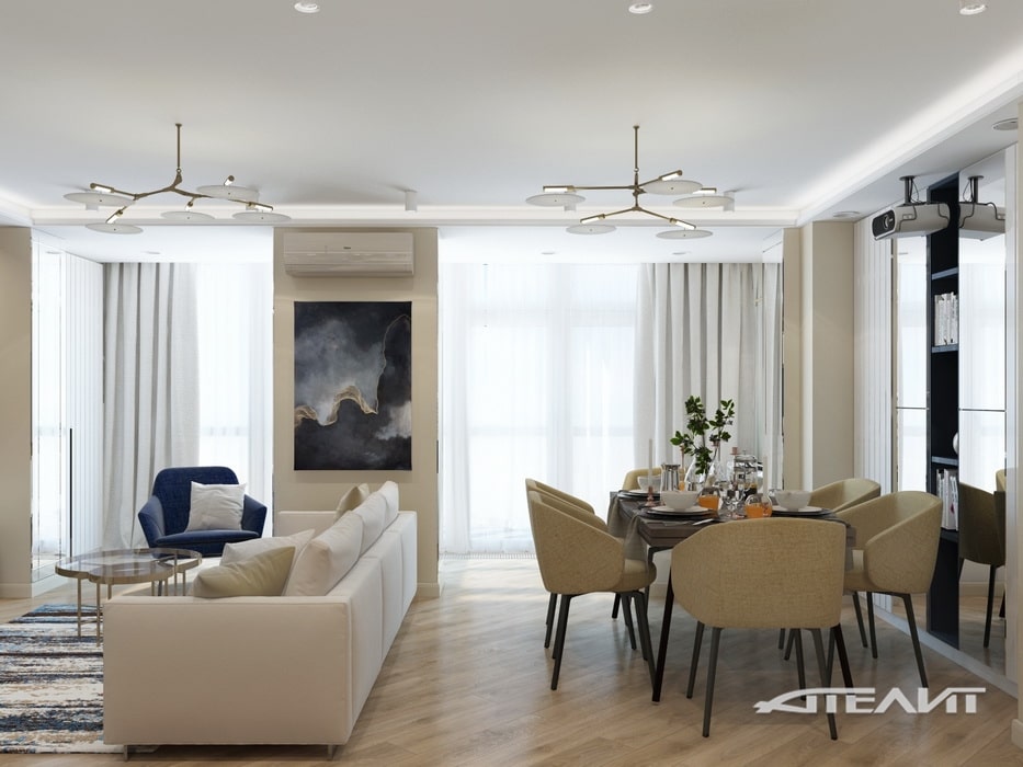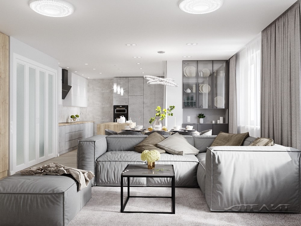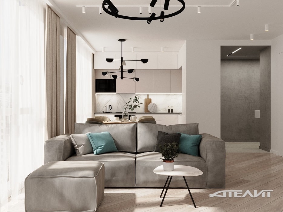 Уютная, просторная и современная квартира в светлых тонах от компании «Ателит». Главное объединяющее помещение здесь – эта гостиная, которая с кухней и столовой представляет единое пространство. Также для каждого члена семьи выделены приватные зоны, где они могут с комфортом проводить время.