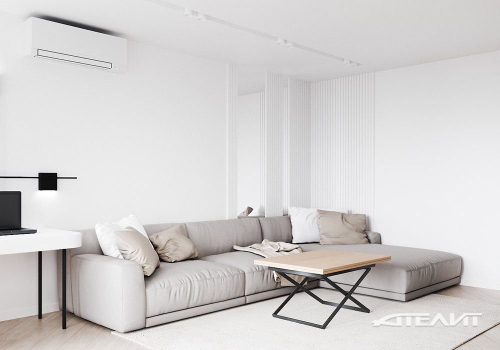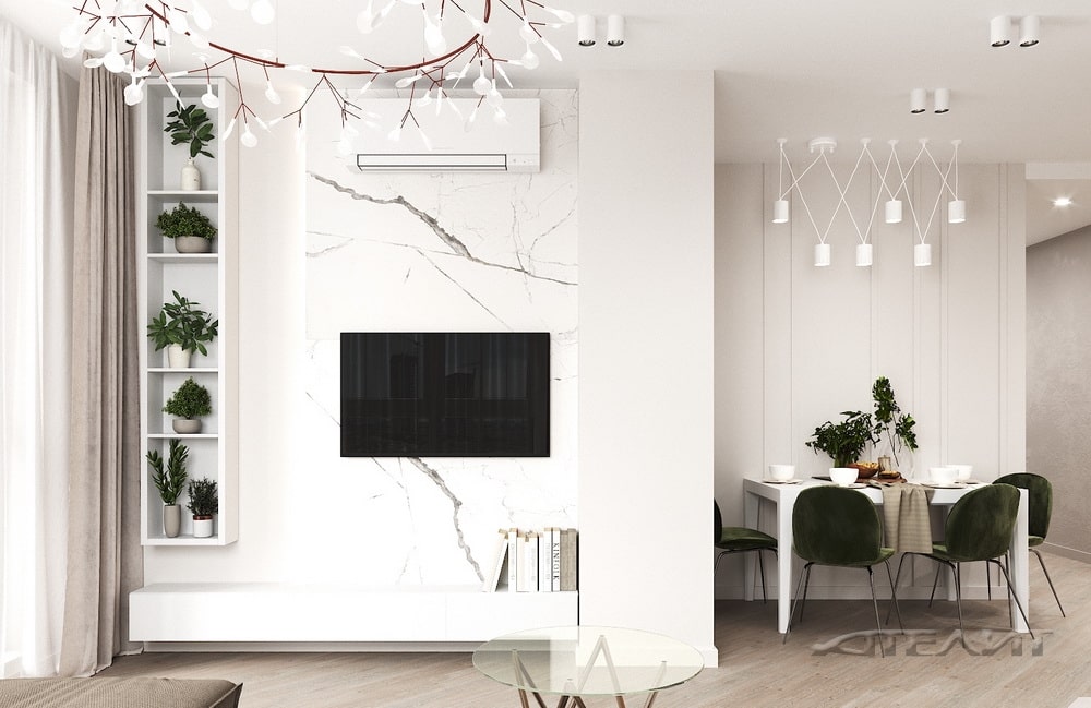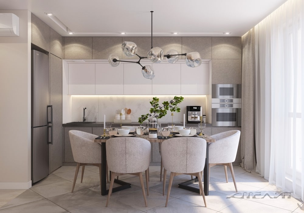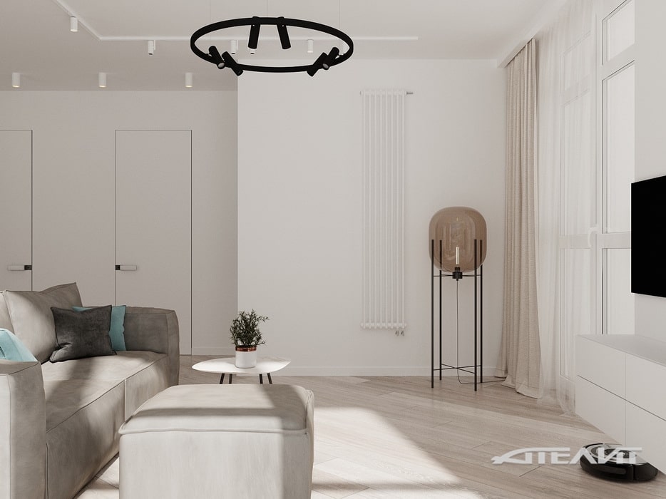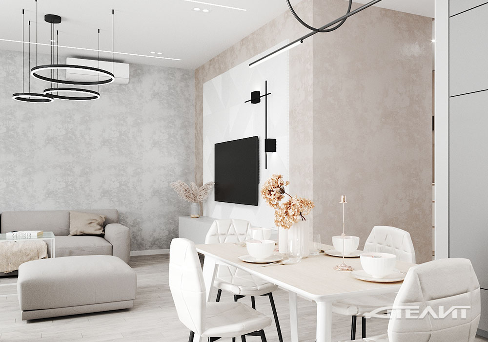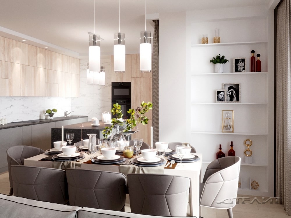 Уютная, просторная и современная квартира в светлых тонах от компании «Ателит». Главное объединяющее помещение здесь – эта гостиная, которая с кухней и столовой представляет единое пространство. Также для каждого члена семьи выделены приватные зоны, где они могут с комфортом проводить время.
