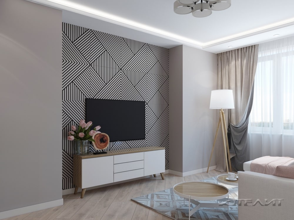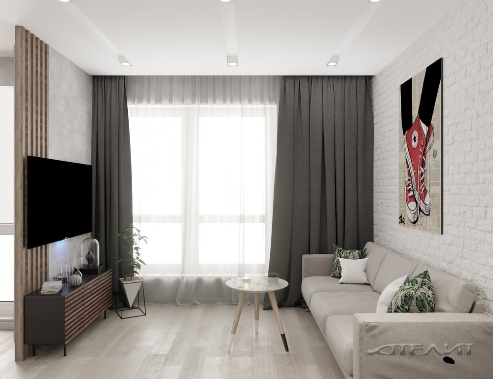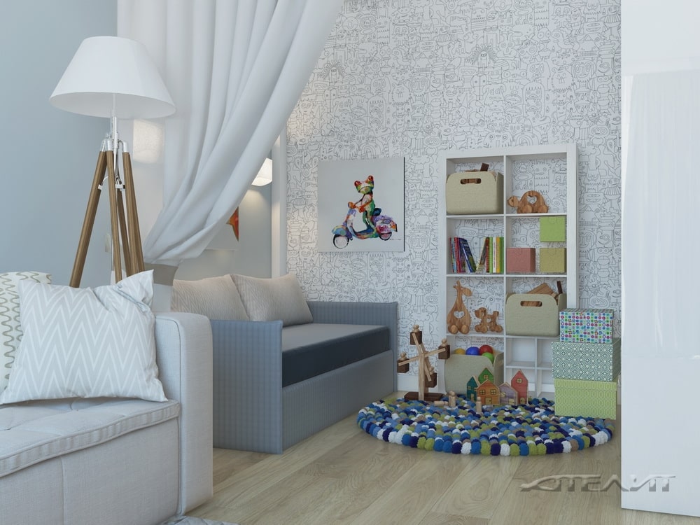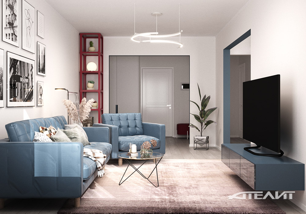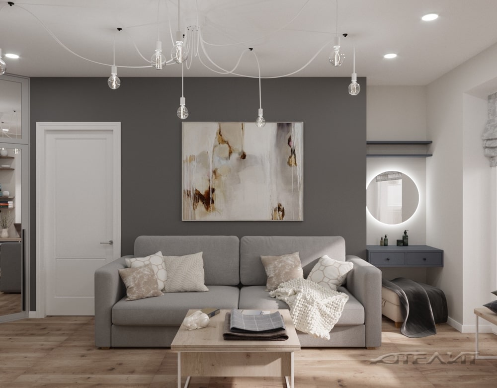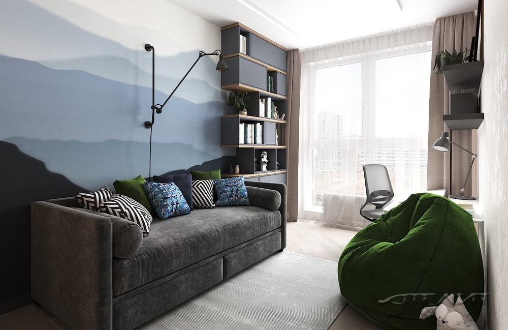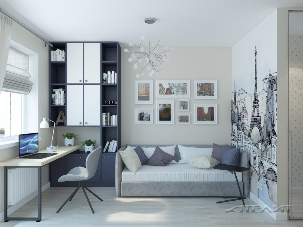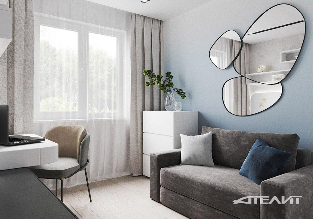 Компактная квартира в современном стиле с двумя комнатами для детей разного возраста от компании «Ателит». Для каждого члена семьи создано удобное жилое пространство. Спальня и гостиная преобразованы в единое помещение с грамотно разделёнными функциональными зонами.