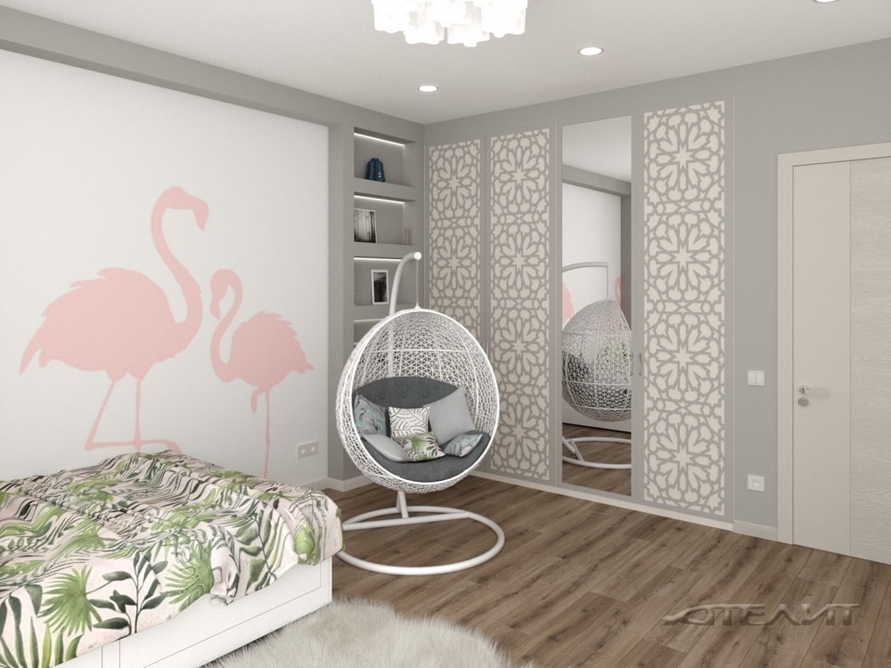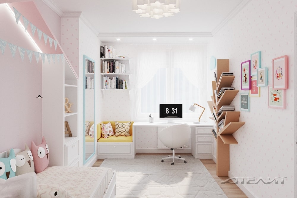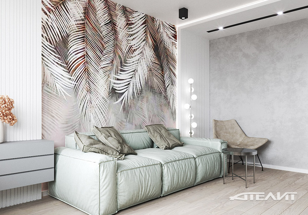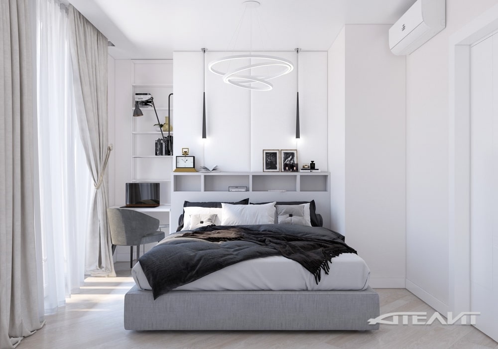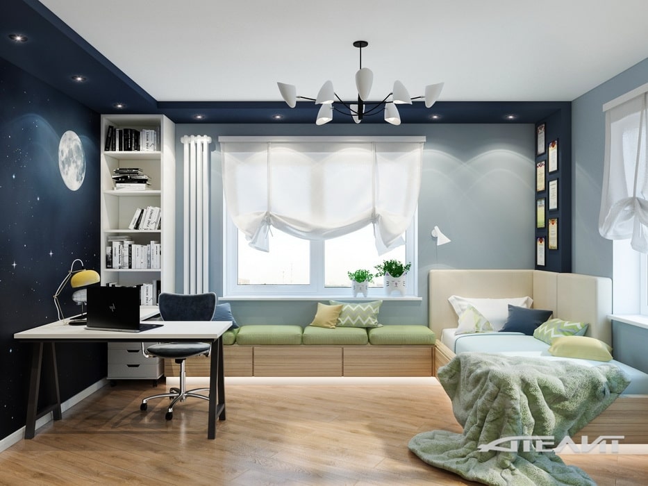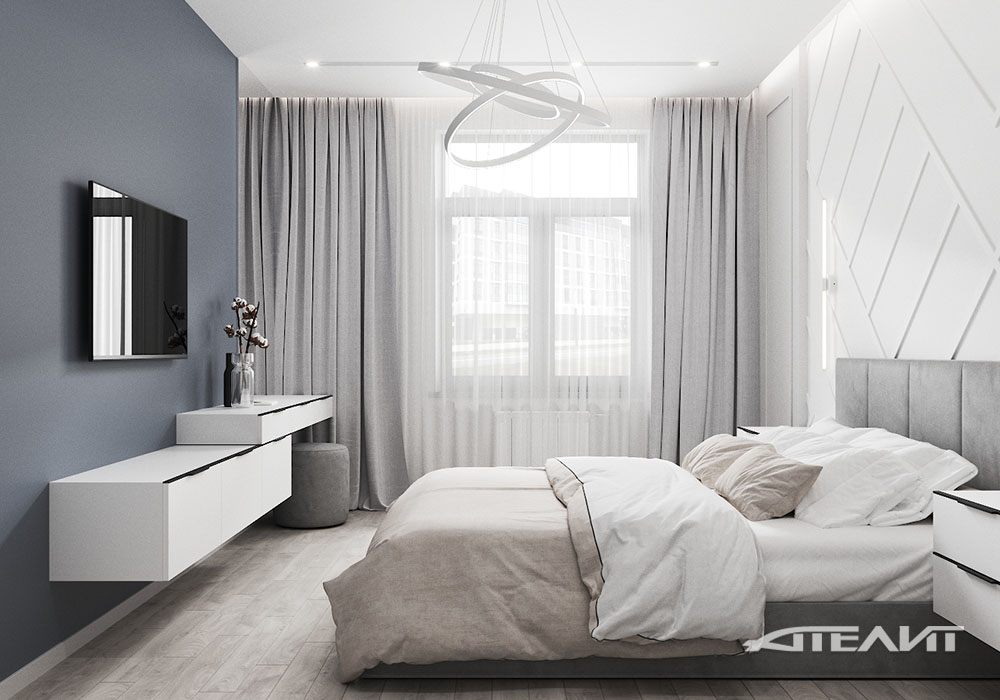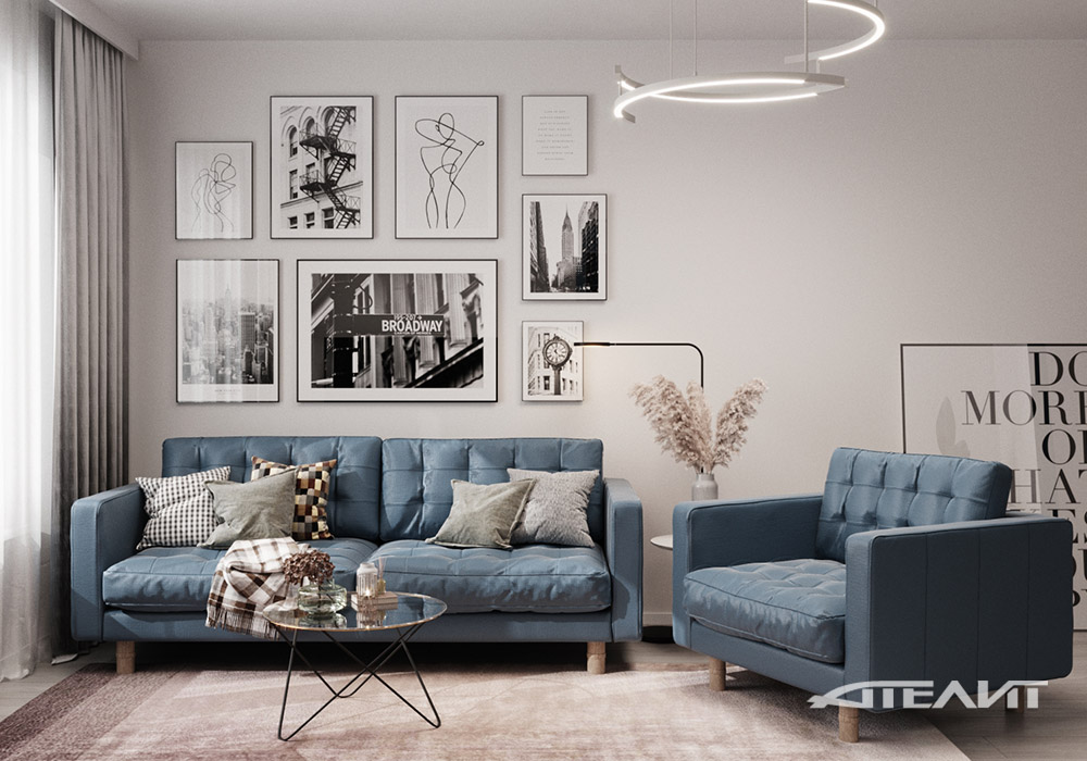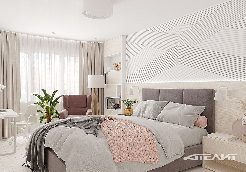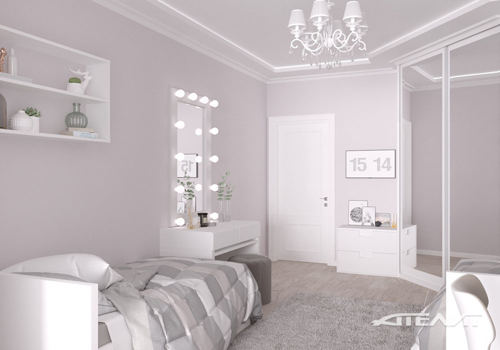 Компактная квартира в современном стиле с двумя комнатами для детей разного возраста от компании «Ателит». Для каждого члена семьи создано удобное жилое пространство. Спальня и гостиная преобразованы в единое помещение с грамотно разделёнными функциональными зонами.