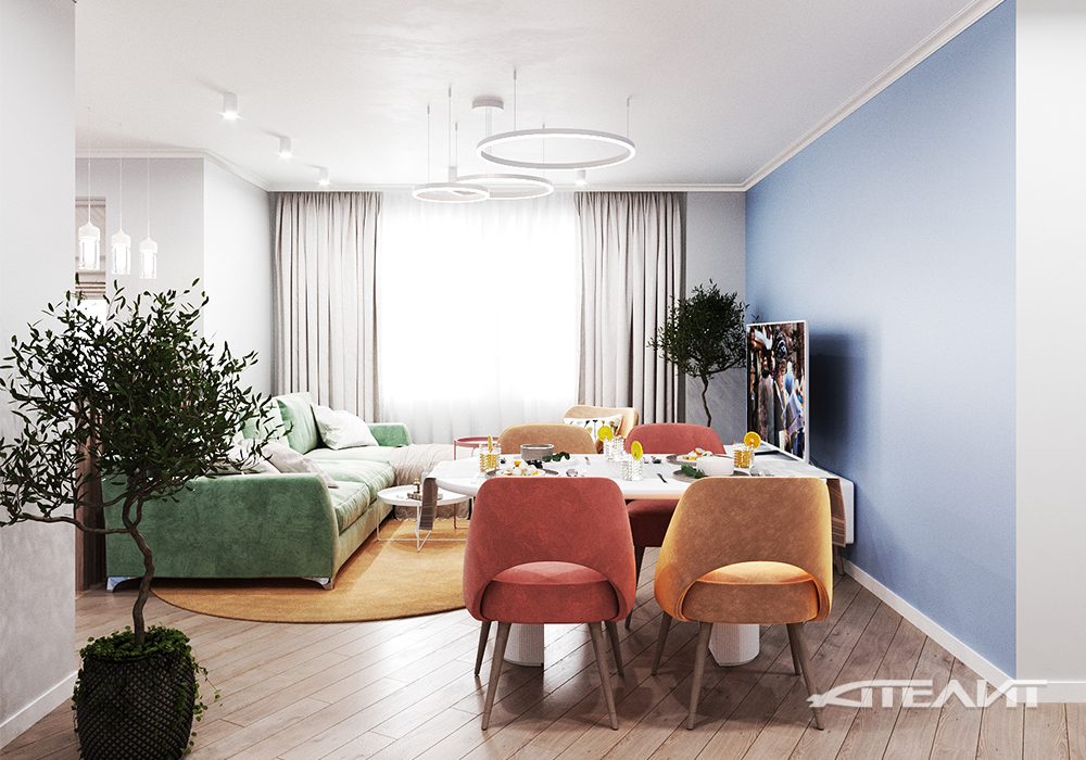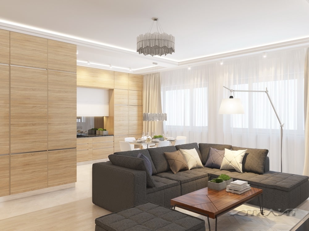 Задача: Оформить удобное жилье для большой семьи в современном стиле. Разработать оригинальное оформление помещения, которое одновременно выполняет роль гостиной, кухни и столовой. Оформить спальню и детскую с ориентиром на выбранные заказчиком цветовые решения. Грамотно подобрать мебель, отделку комнат и аксессуары, которые сделали бы квартиру не только стильной, но и уютной.