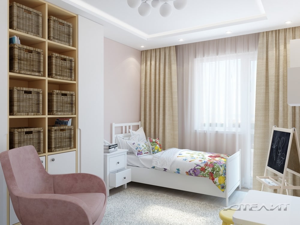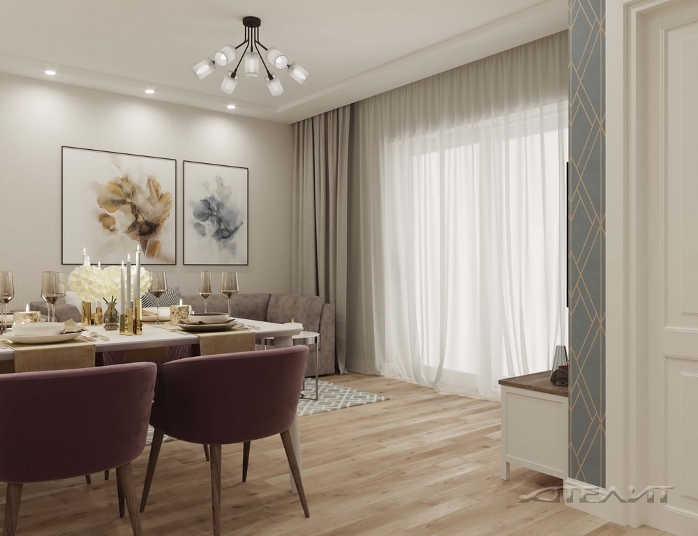 Стильная квартира в современном стиле с элементами классического декора. Светлые пастельные тона в отделке гармонично дополнены насыщенными цветовыми акцентами стен, мебели, штор, что при обилии естественного света создает ощущение легкости и простора. Профессионализм дизайнера позволил на относительно небольшой площади создать продуманную функциональную планировку для комфортной жизни молодой семьи.