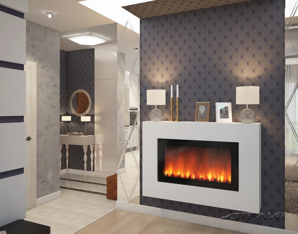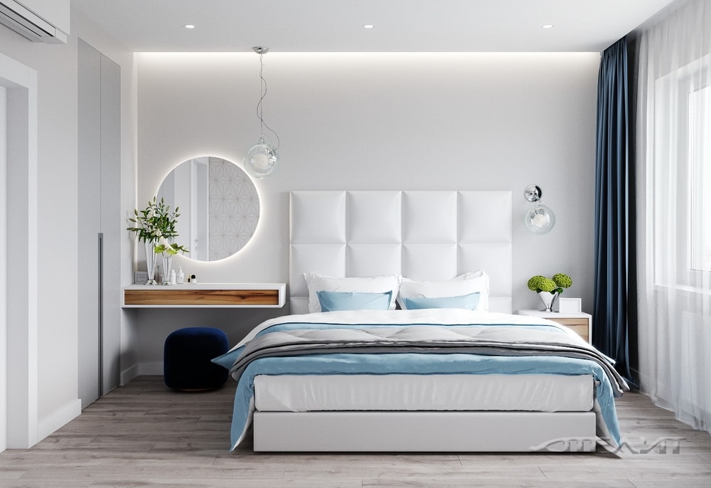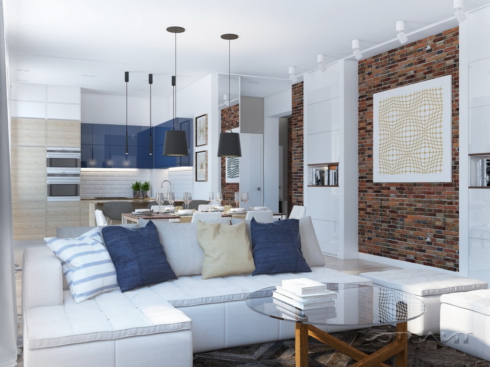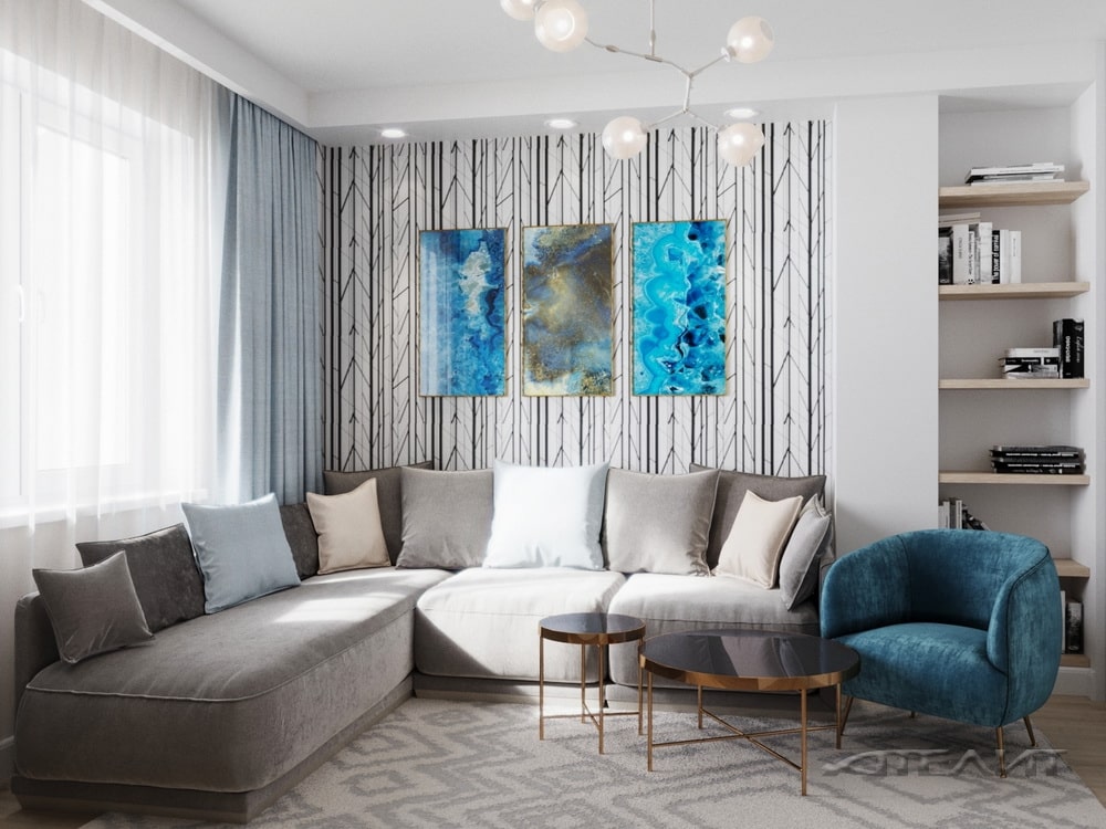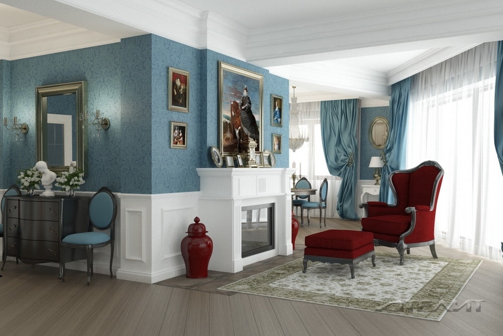 Комбинирование синего и белого в гостиной становится главным дизайнерским приемом. Игра на контрастах, добавление аксессуаров (картины, зеркала, лампы) и мебели помогло дизайнерам сформировать особую стилистику комнаты. Обратите внимание на камин и контрастную обивку кресла и пуфа.