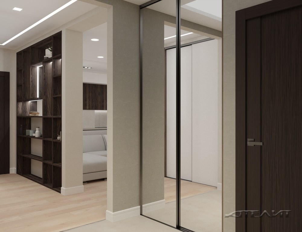 Дизайнеры подготовили грамотное планировочное решение для гостиной-кухни и оформили прихожую таким образом, чтобы ее интерьер не выбивался из общей концепции.