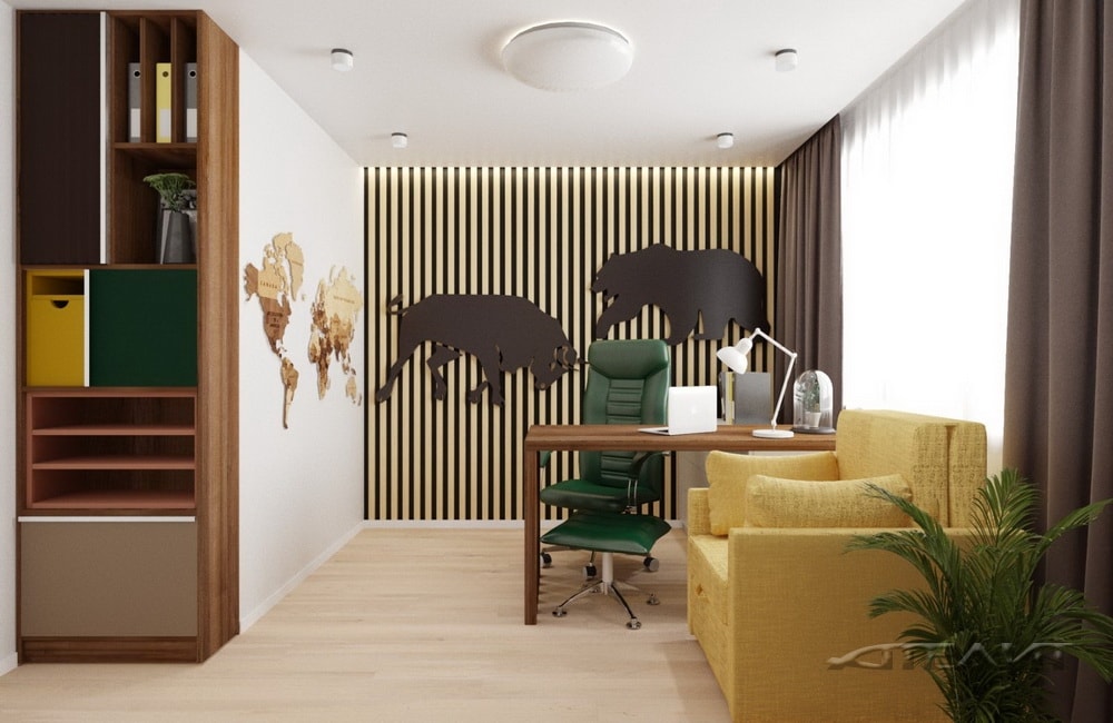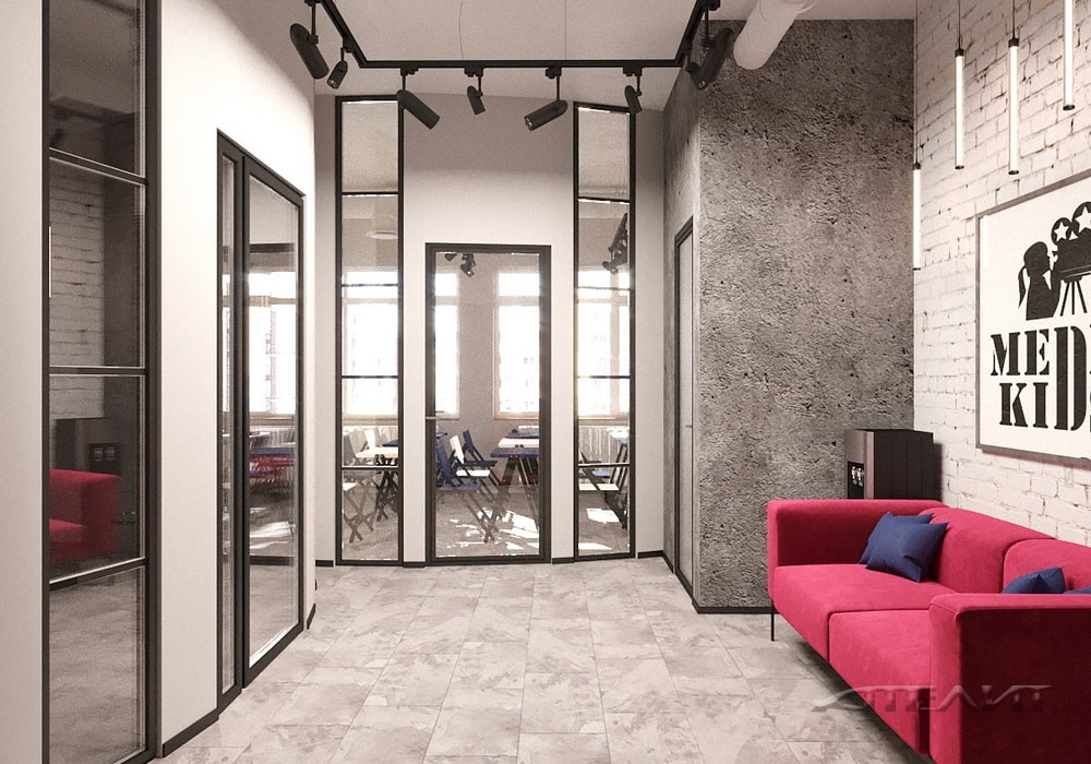 Дизайн выполнен в современном стиле с контрастными цветовыми сочетаниями. Готовность заказчика к экспериментам, в том числе отсутствие боязни ярких оттенков и тональностей, всегда находит положительный отклик у дизайнера, так как это предоставляет гораздо более широкий простор для творческой работы, позволяет активно использовать для создания атмосферы не только фактуры и формы, но и цвет. При этом все рабочие места выполнены в спокойных, строгих оттенках.