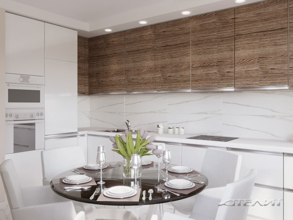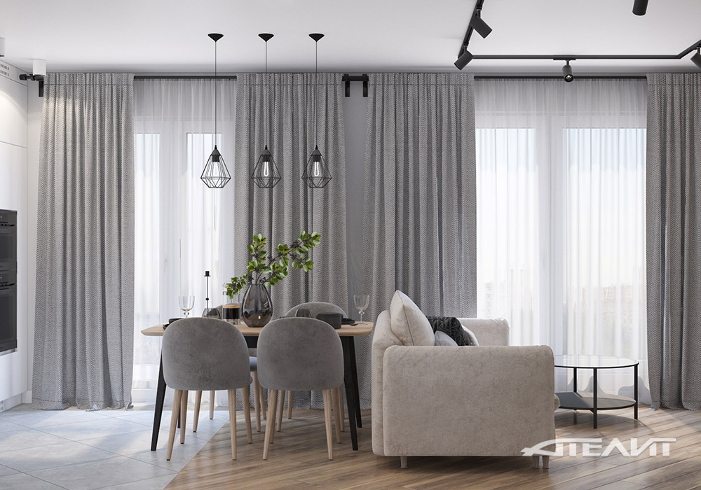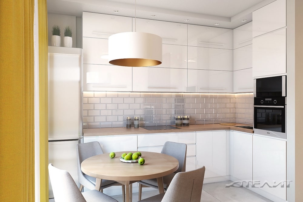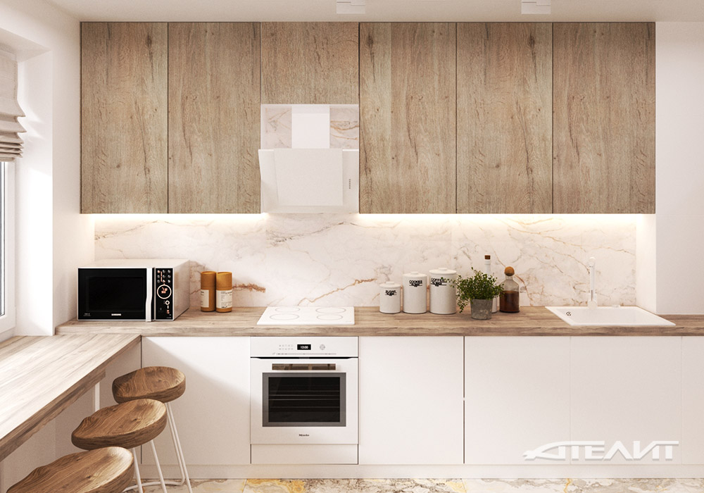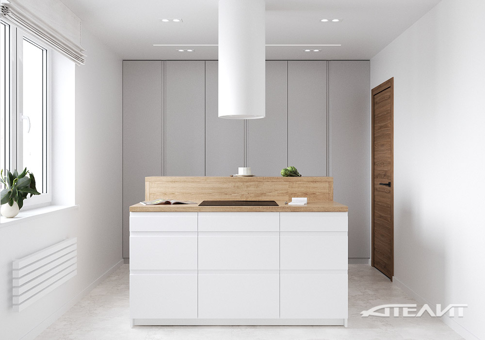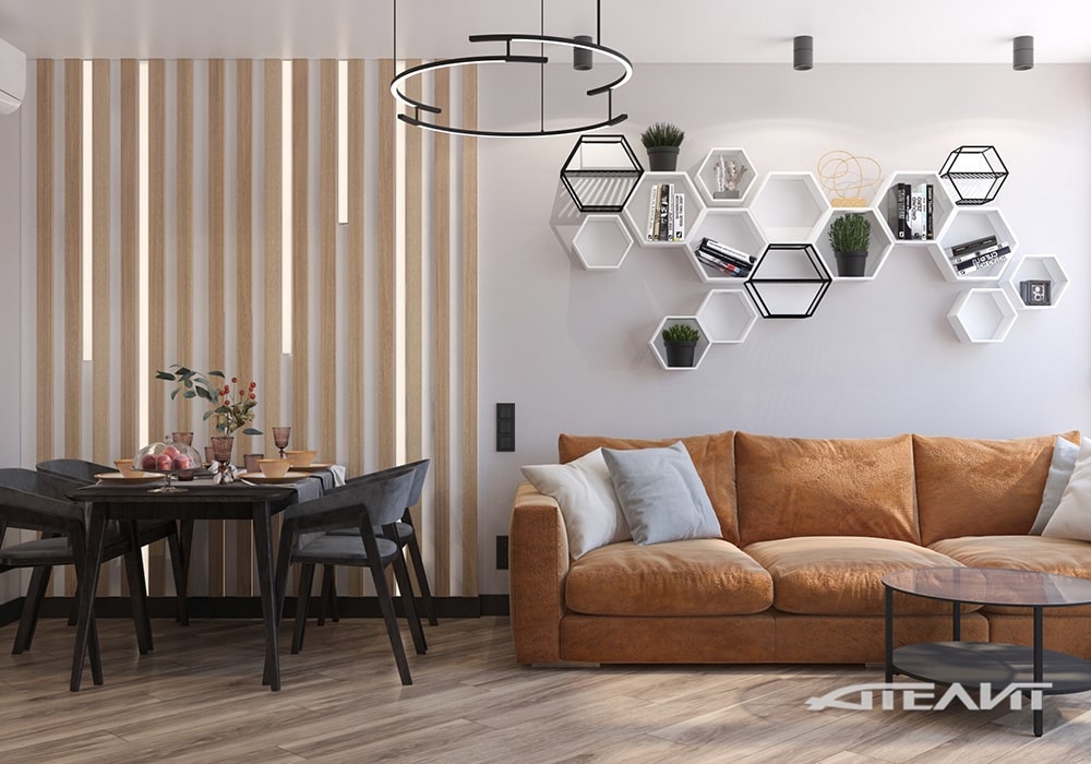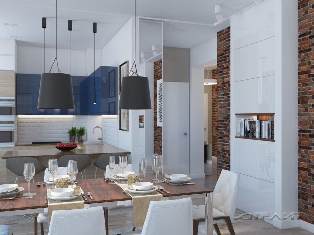 Современная квартира с легким скандинавским оттенком от компании «Ателит». Здесь использованы фактуры дерева, глянцевые поверхности, простые геометрические формы и пространства. Особое внимание уделили освещению – при создании интерьера успешно реализован комбинированный вариант с использованием точечных, подвесных и напольных светильников.