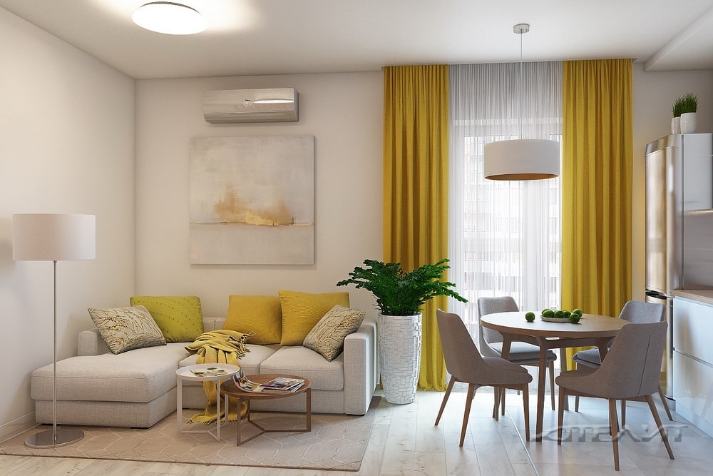 Ограниченное пространство вынудило дизайнеров отказаться от использования перегородок. При этом в помещении удалось компактно разместить угловой диван, телевизор и полноценный обеденный гарнитур, который позволяет использовать комнату как столовую.