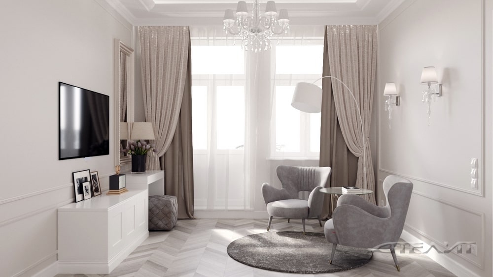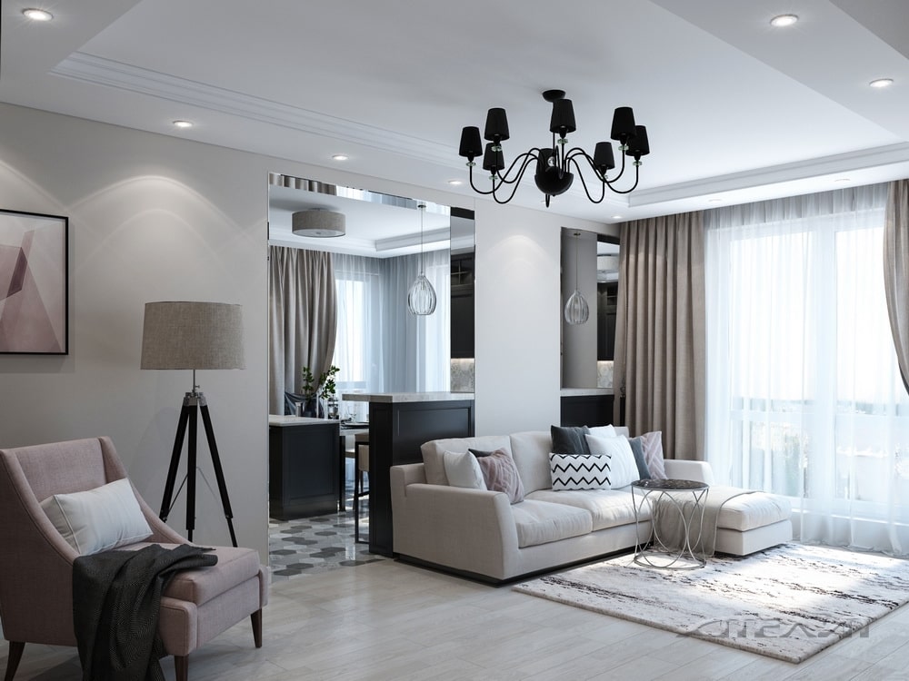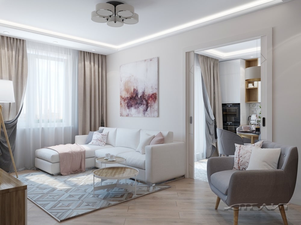 Уютная квартира в светлых тонах с изолированными комнатами. Зону гостиной изолировали с помощью четырёхсекционной стеклянной перегородки в металлическом каркасе, две створки которой открываются. Кладовую преобразовали в функциональную гардеробную. Чтобы у заказчика была возможность выбора, дизайнеры разработали несколько вариантов проектов в разной цветовой гамме.