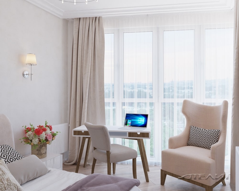 Интерьер этой небольшой квартиры проектировался для проживания молодой девушки, что соответствующим образом отразилось как на обустройстве пространства, так и на его стилистическом оформлении. Здесь достаточно мест хранения для одежды и предметов обихода, рабочее место, совмещающее в себе также функции туалетного столика и лоджия, на которой можно с комфортом проводить досуг. Интерьер в спокойных теплых тонах располагает к уюту, а отсутствие активных цветовых акцентов и принтов создает ощущение легкости и непосредственности.