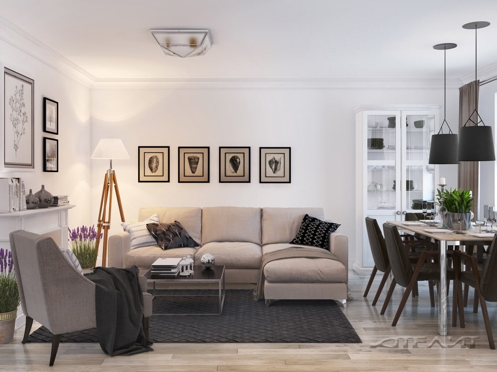 Дизайнеры доработали планировку так, чтобы превратить гостиную в комфортное пространство, в котором с удовольствием будут собираться обитатели квартиры. Специалисты постарались максимально задействовать все преимущества объединения гостиной, кухни и столовой.