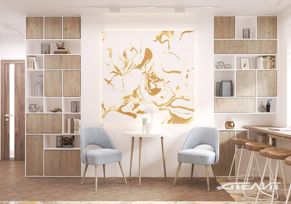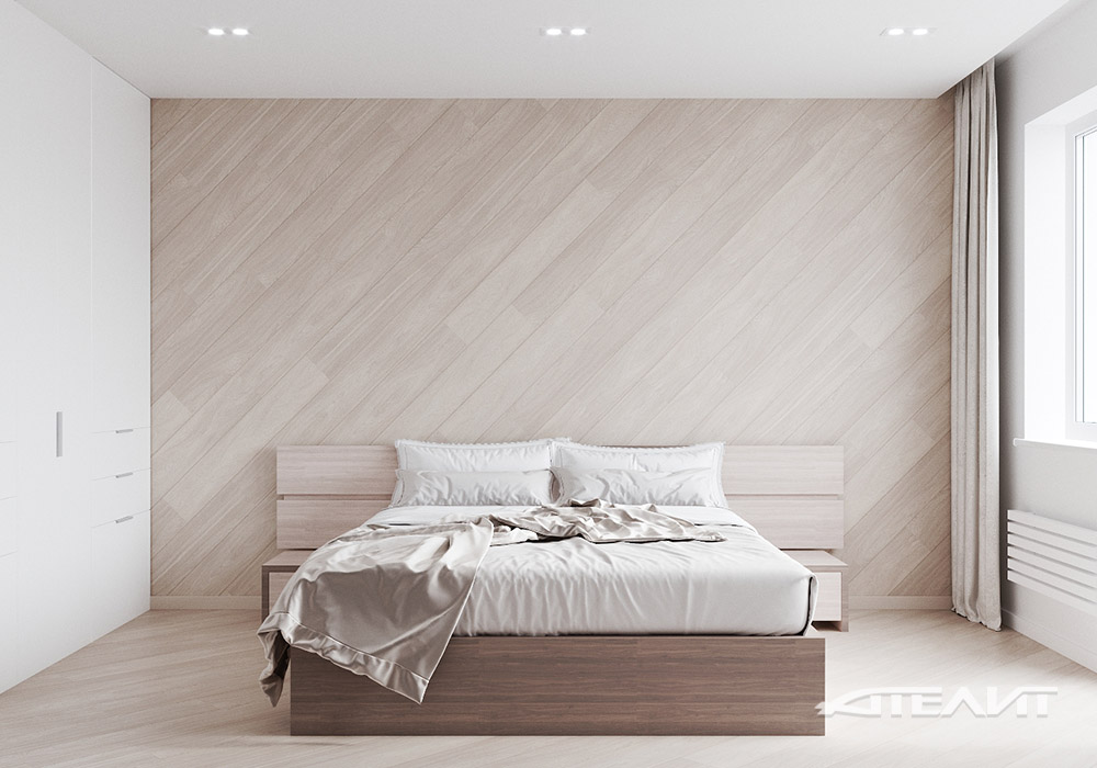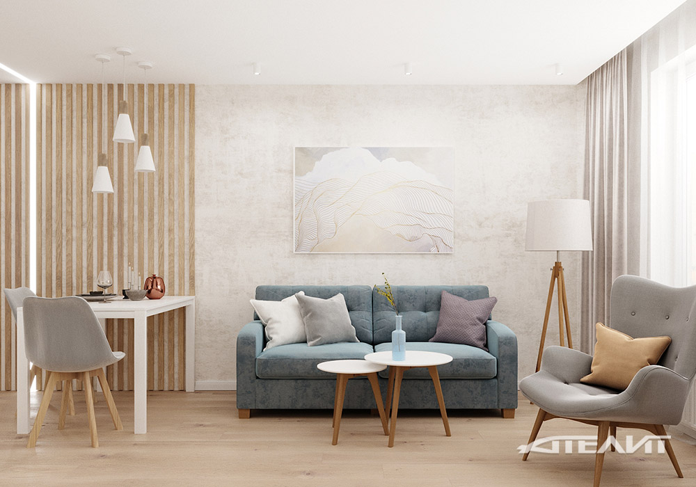 После долгих обсуждений с заказчиком проекта будущей квартиры было принято решение превратить ее в квартиру-студию и конечный результат подтвердил правильность этого выбора. Никаких лишних перегородок и ограниченных пространств - все выполнено одним объемом, и только лишь зона спальни условно отделена раздвижной стеклянной перегородкой. Примененный здесь скандинавский стиль привносит спокойствие и умиротворение за счет использования светлых тонов и мягкой природной фактуры дерева.