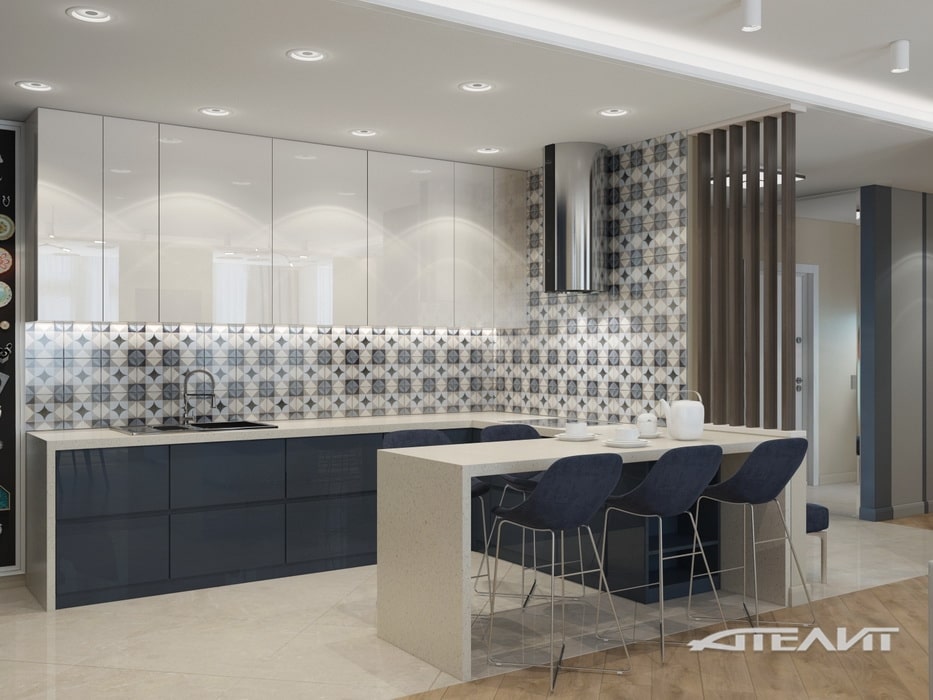 Просторная квартира от компании «Ателит». Нужно было зонировать пространство гостиной-кухни, разделив функциональные зоны за счет грамотных интерьерных решений. По согласованию с заказчиками, дизайнеры разработали два варианта оформления комнаты, каждый из которых имеет свои преимущества. Был разработан дизайн двух спален, детской, прихожей и санузла.
