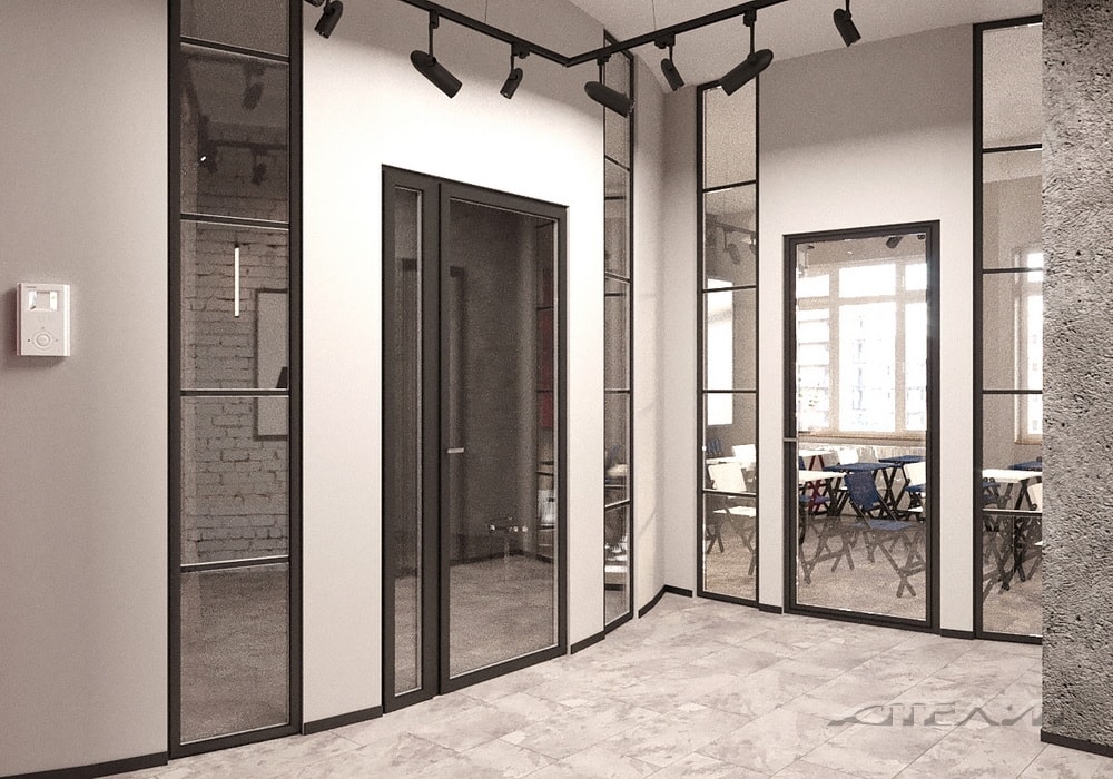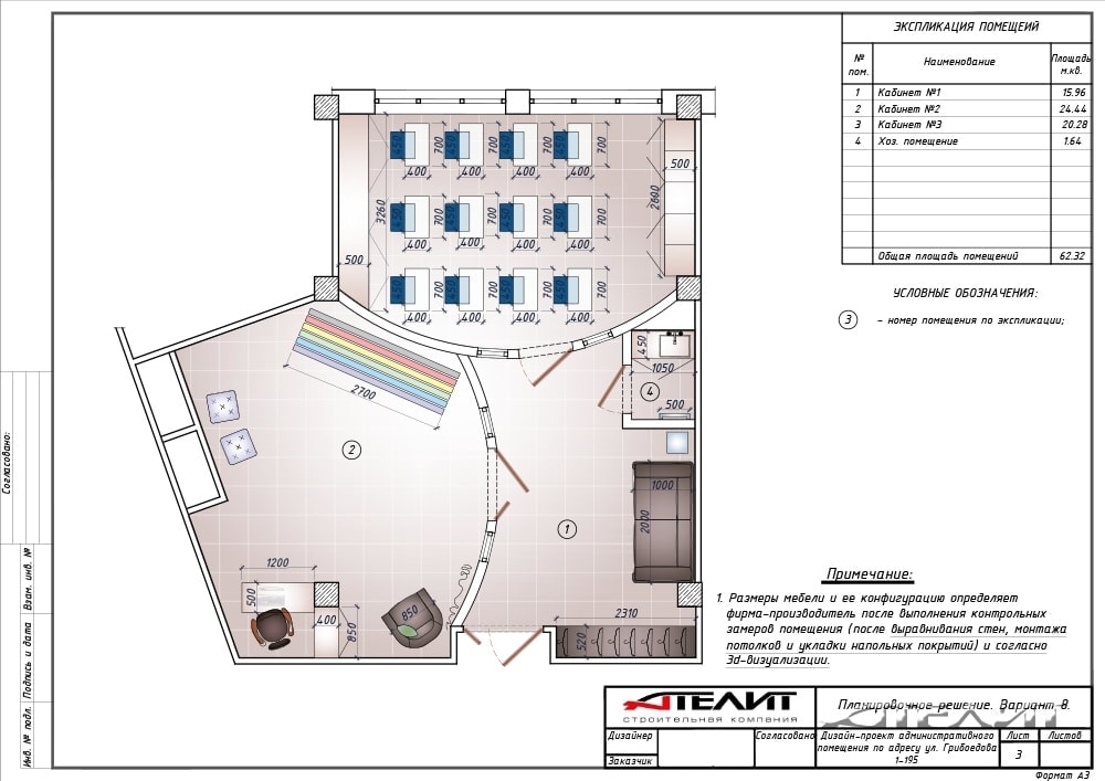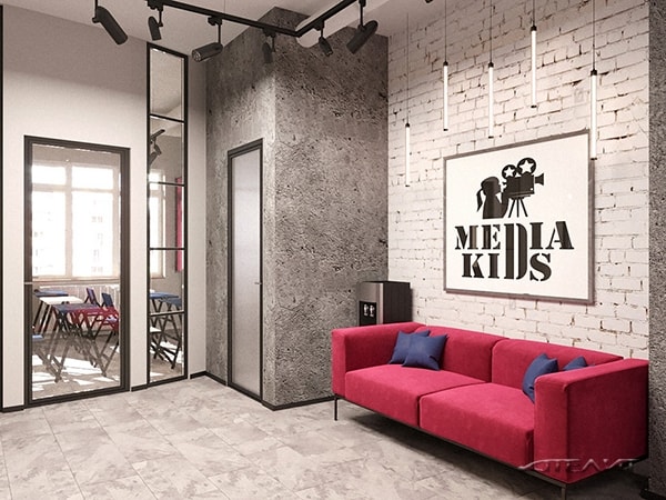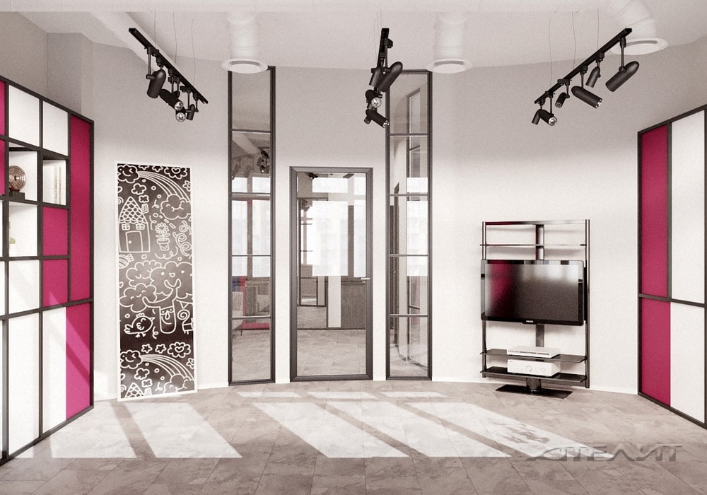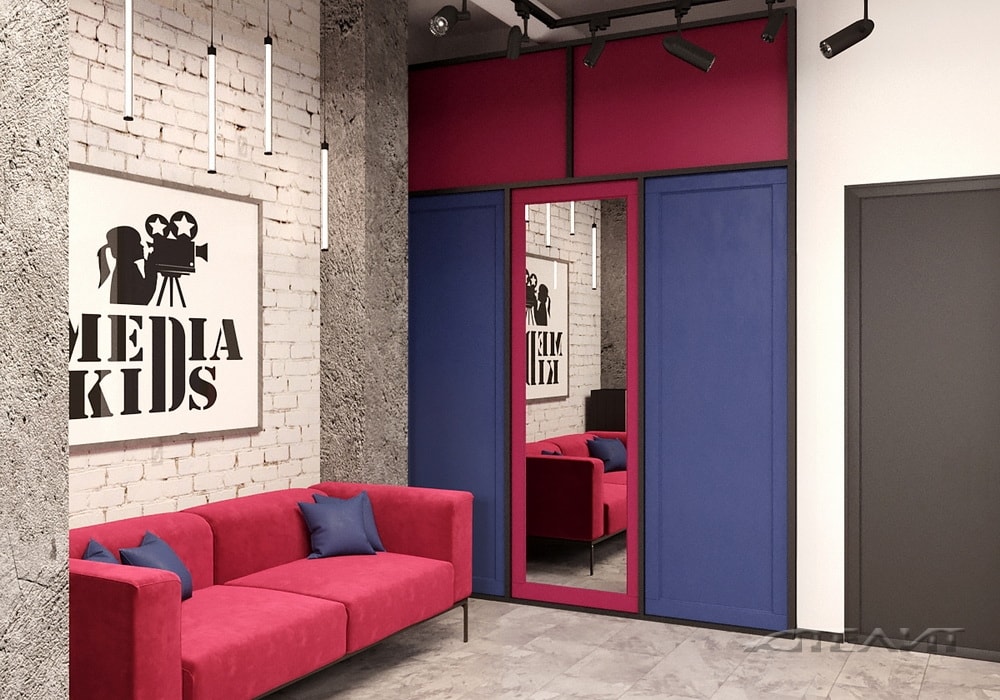 Задача: Разработать стильный и удобный интерьер для творческой студии с учетом профессиональных требований к оборудованию учебных кабинетов и холла, размерам и конфигурации мебели, а также специализированного оборудования.