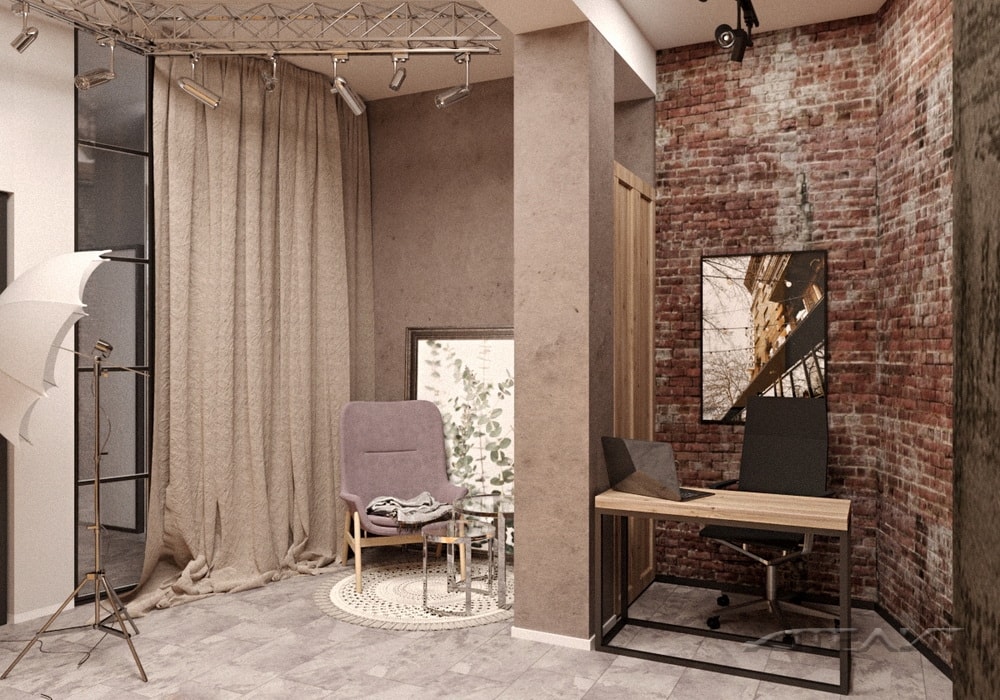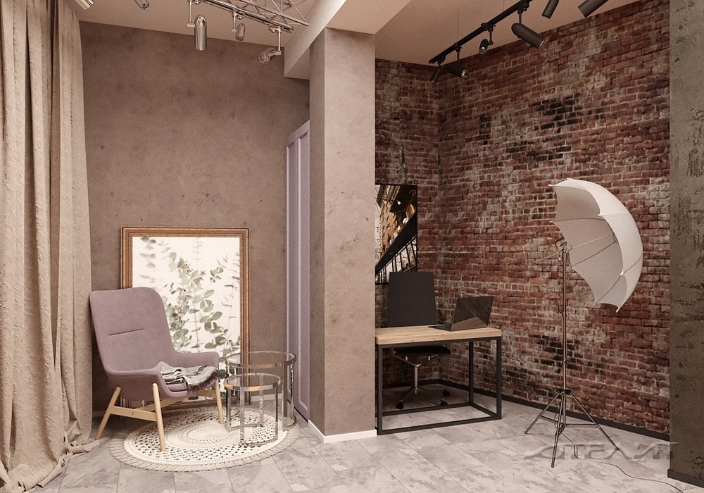 Помещение оформлено в стиле лофт, что соответствует концепции студии. Направленное освещение позволило избавиться от плохо освещенных мест. Нашлось место для удобного дивана и гардероба.