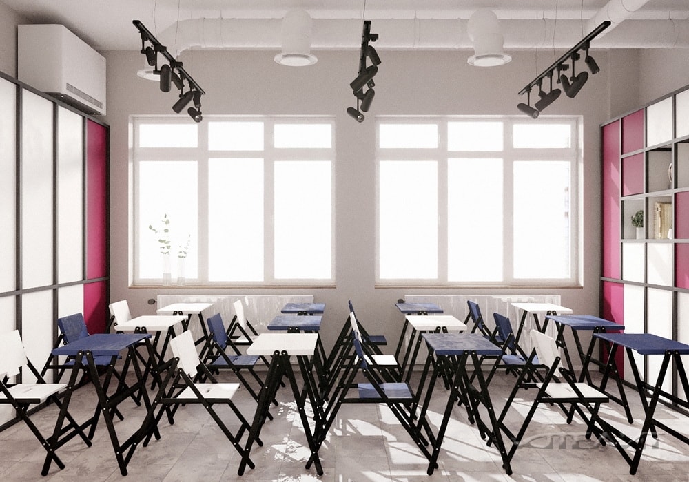 Представляет собой учебный класс и мастерскую. Помещение оформлено в строгой монохромной гамме, а фасады цвета фуксии и синие детали мебели создают красивые акценты, которые перекликаются с цветом мебели в холле. При необходимости парты легко складываются, что позволяет легко получить дополнительное помещение с прекрасным освещением, которое идеально подходит для творческой работы.