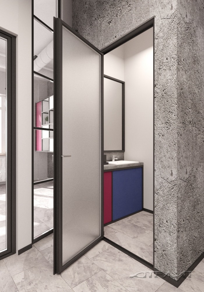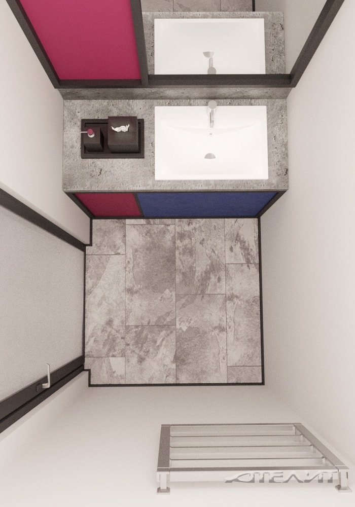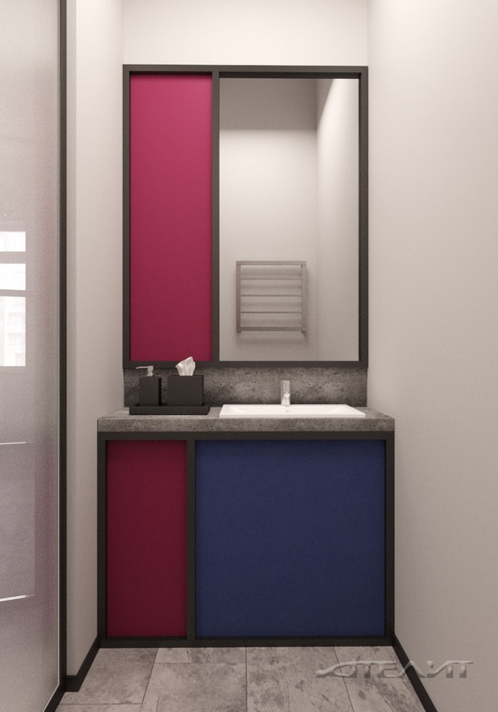 В оформлении преобладают четкие грани и прямые линии. Использованы те же оттенки синего и сиреневого, что и при оформлении холла с кабинетом. Для хранения хозяйственных принадлежностей предусмотрены полки под раковиной.